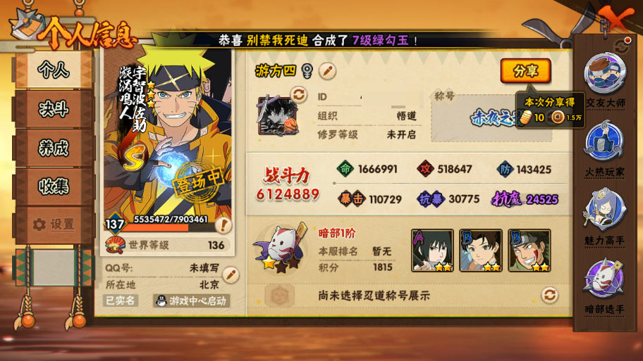 612w战力白破五影斑13S+5个198直购A/32A+创柱81碎片+1.4万金币