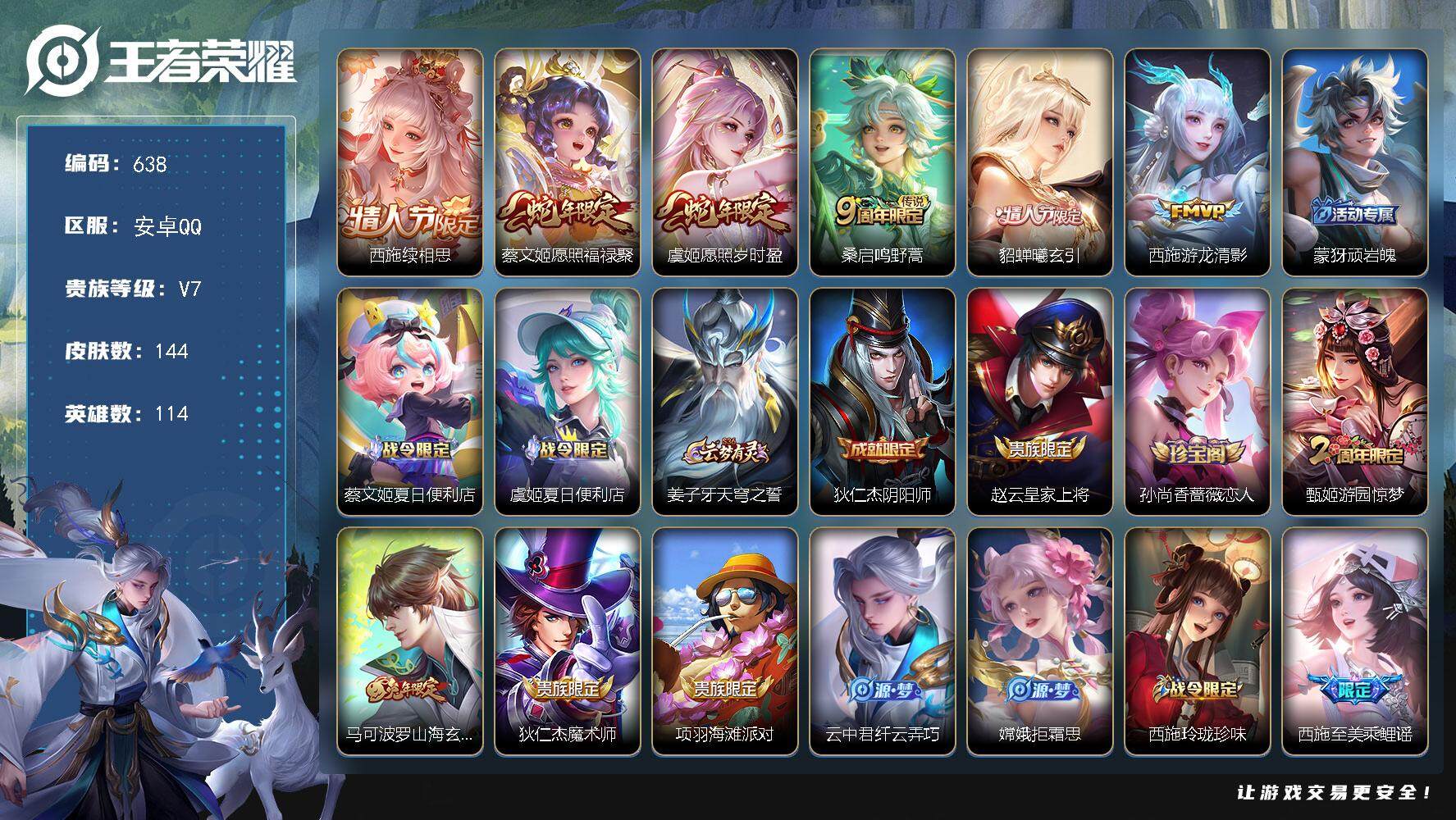 营地账号:/1839147 纯女号 西施全皮 安卓Q-V7-至尊星耀II段位-114英雄-144皮肤-6传说-46史诗