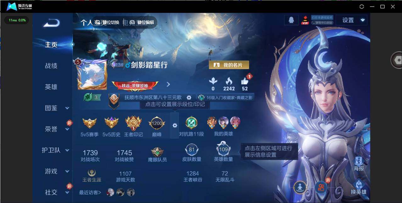 营地账号:/1839190 王者荣耀账号 安卓Q-V5-至尊星耀I段位-109英雄-81皮肤-1典藏皮肤-2传说-18史诗