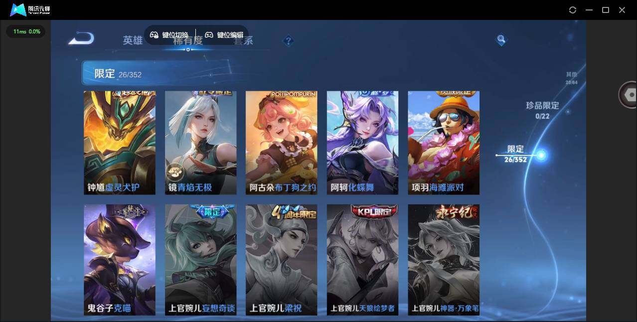 【限定皮肤】:狄仁杰阴阳师,赵云皇家上将,元歌云间偶戏,项羽海滩派对,裴擒虎李小龙,西施玲珑珍味,沈梦溪龙舞盛年,镜青焰无极,周瑜熔金海岸