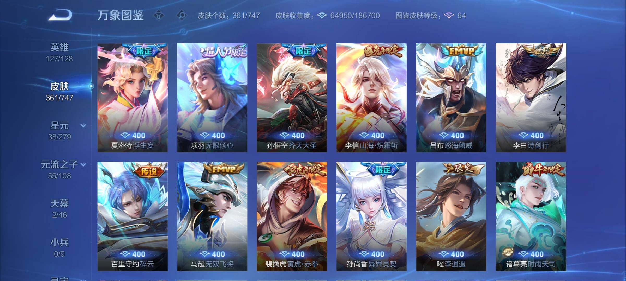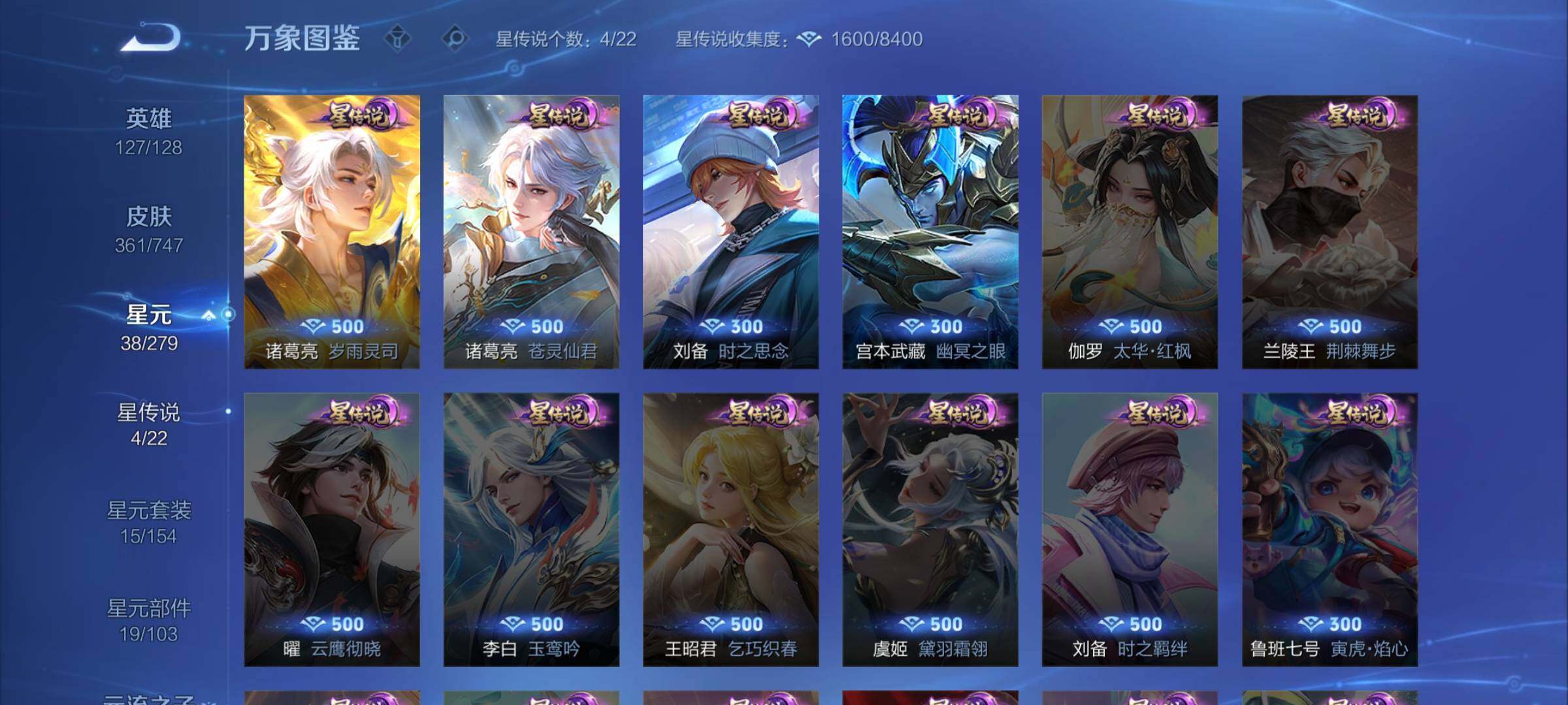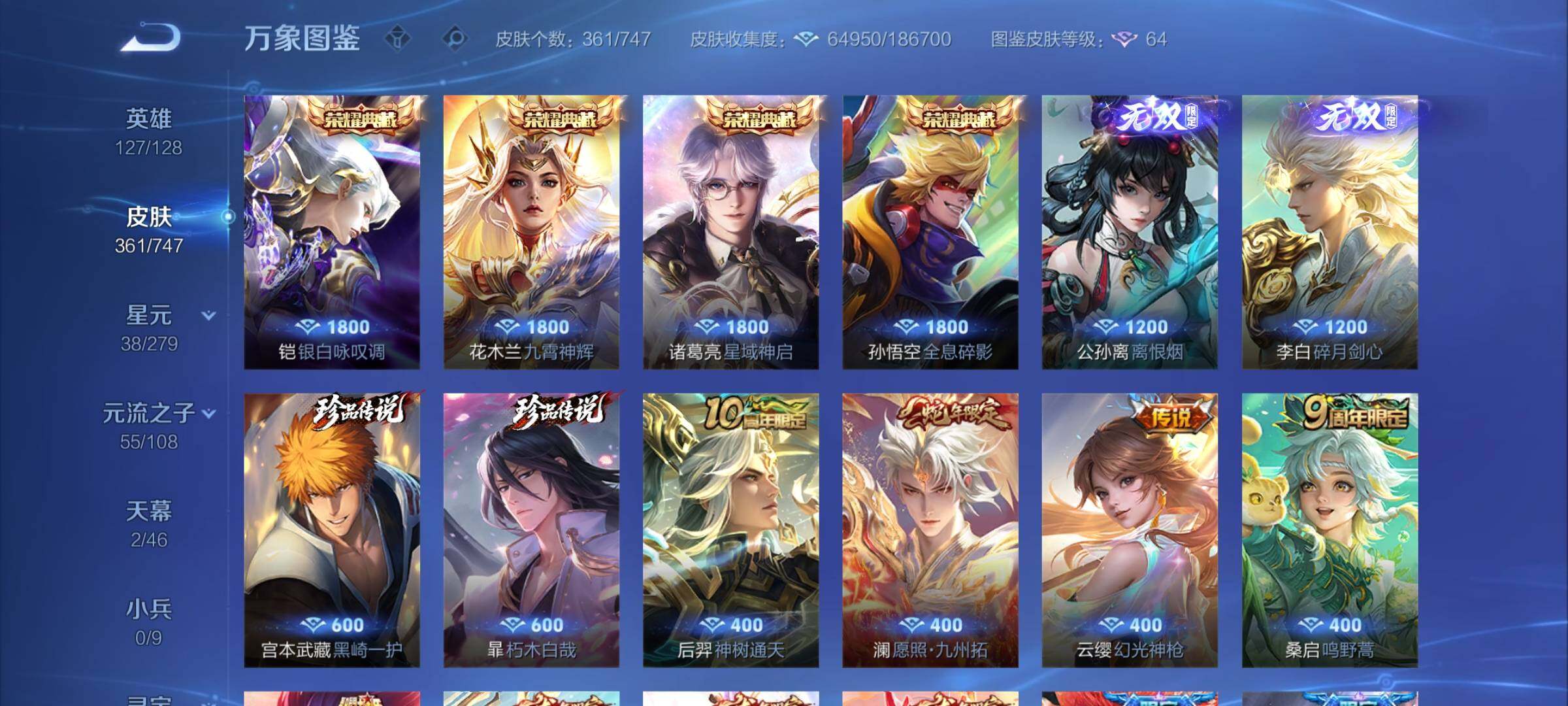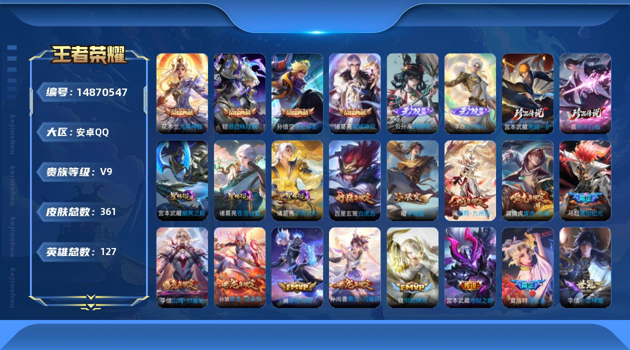 安卓q-127英雄-361皮肤-13王者印记-140铭文-贵族积分13w【贵族9】【4典藏·2无双·