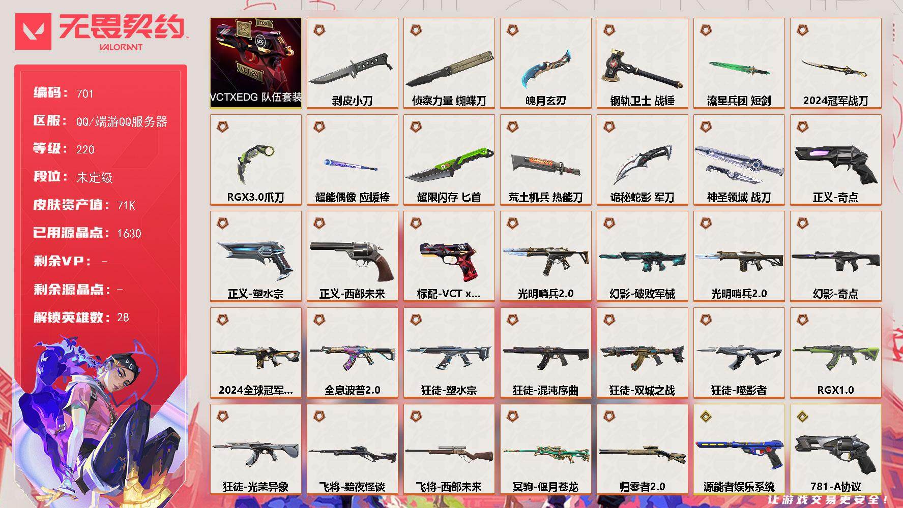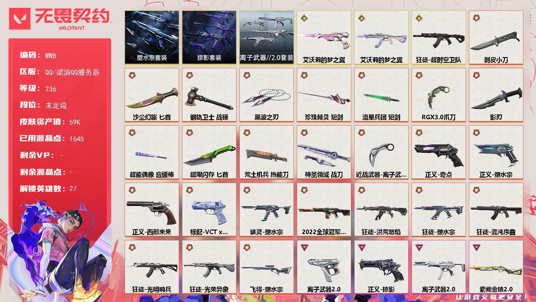 K582/QQ区/库存价值64300/皮肤数量/140 /卡面数量/172/喷漆数量/175/挂件数