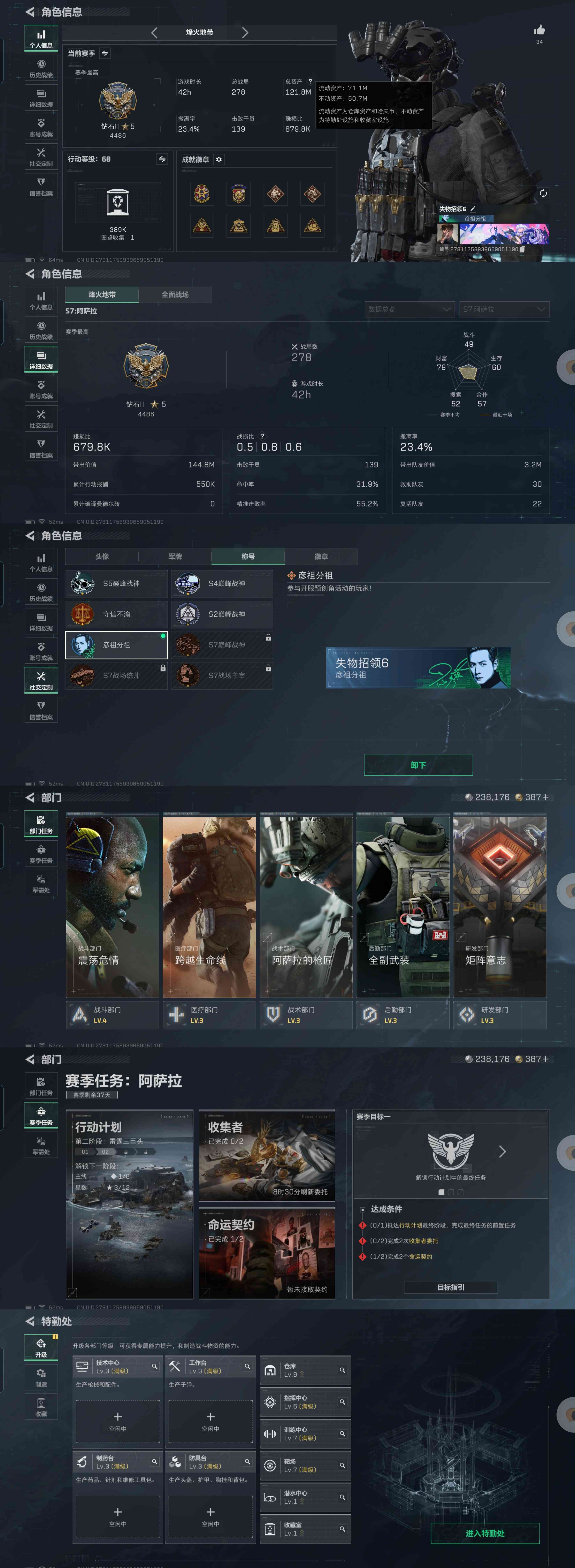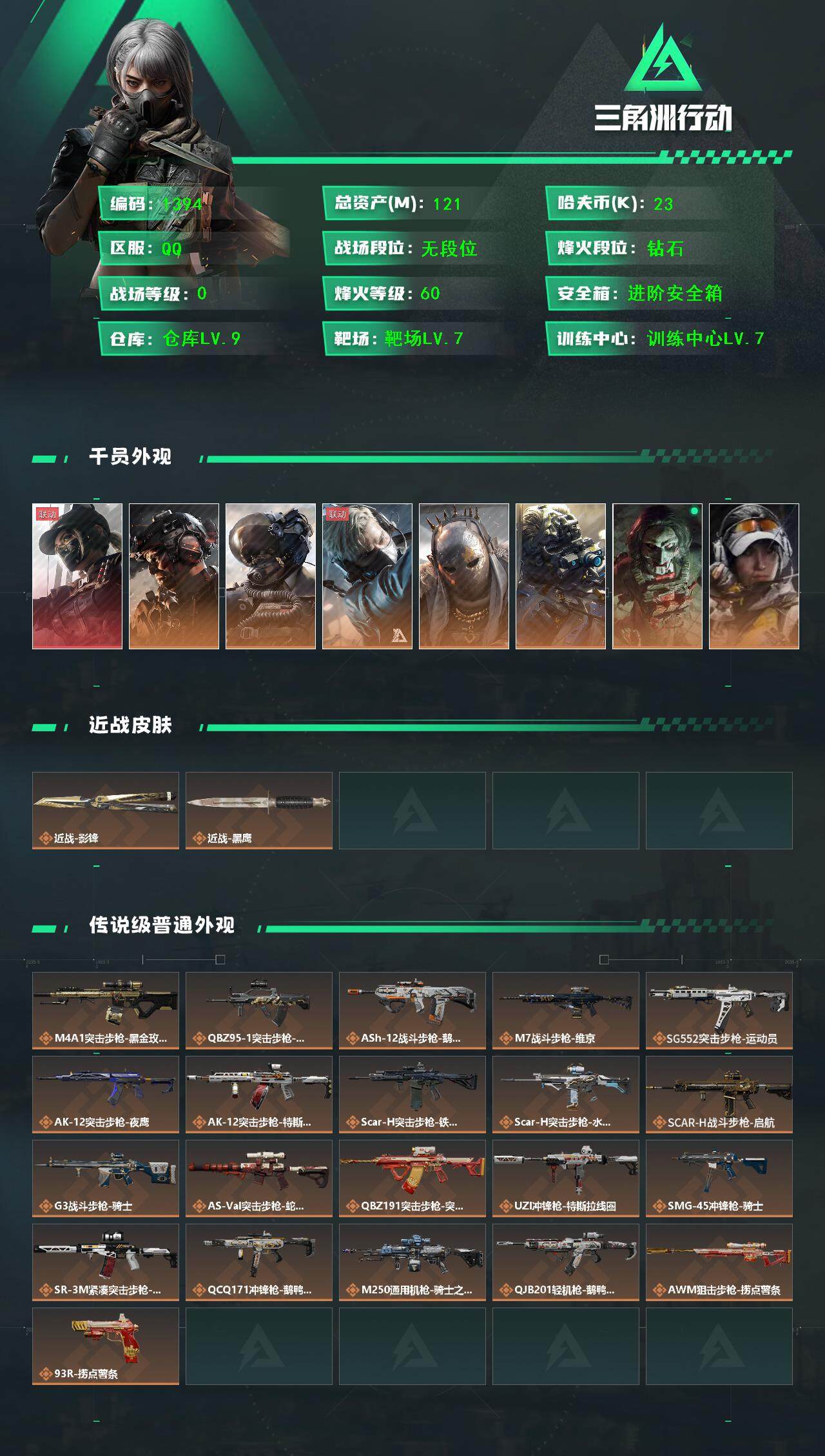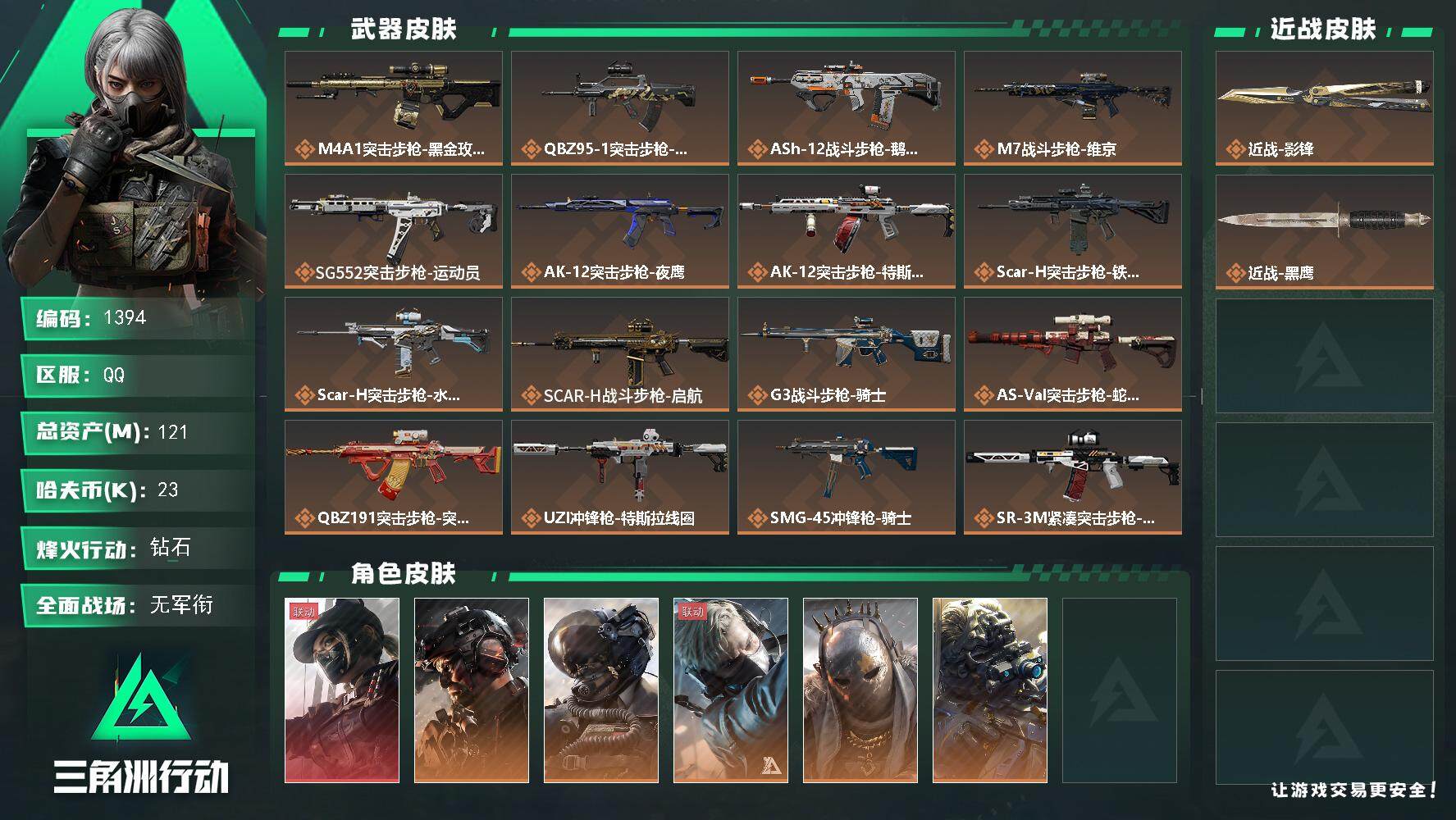 总资产(M):121M/哈夫币(K):23K/哈夫币(K):23K/传说枪皮数:21/烽火地带等级: