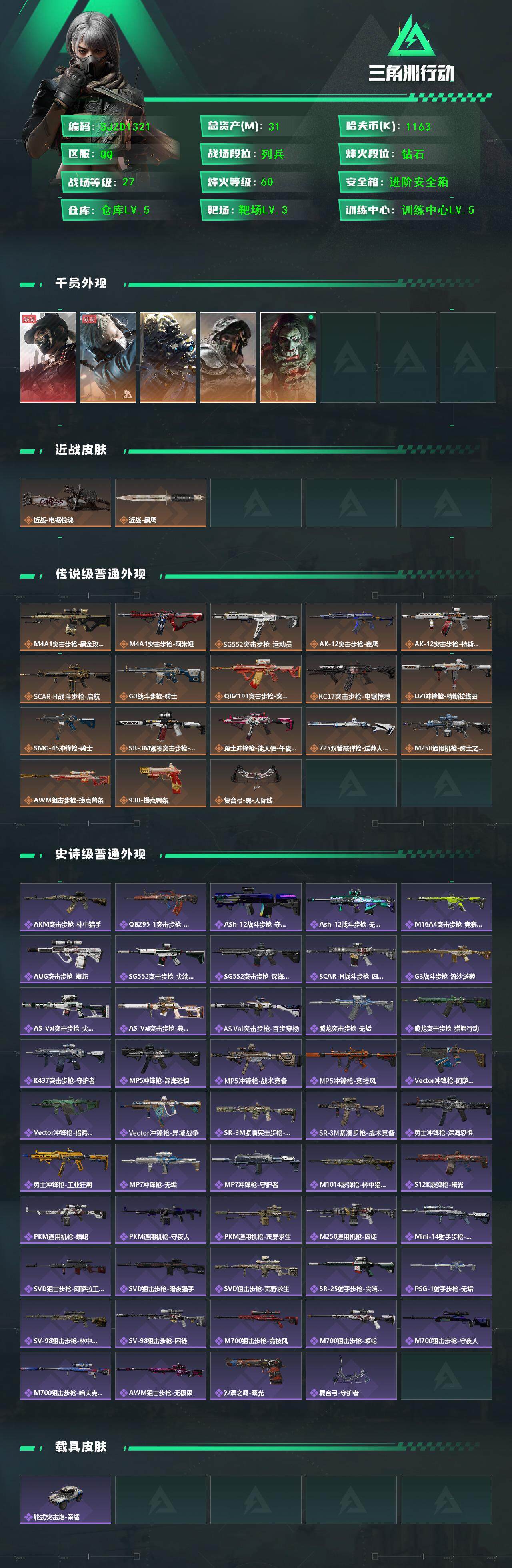 总资产(M):31M/哈夫币(K):1163K/哈夫币(K):1163K/传说枪皮数:18/全面战场