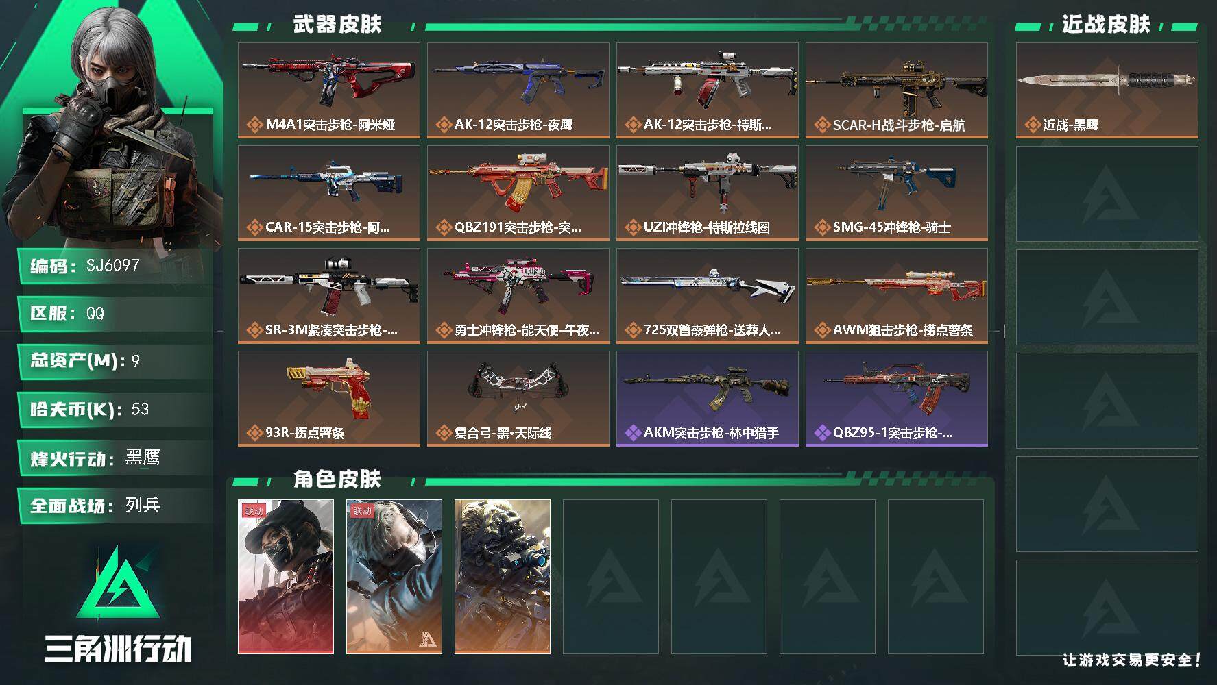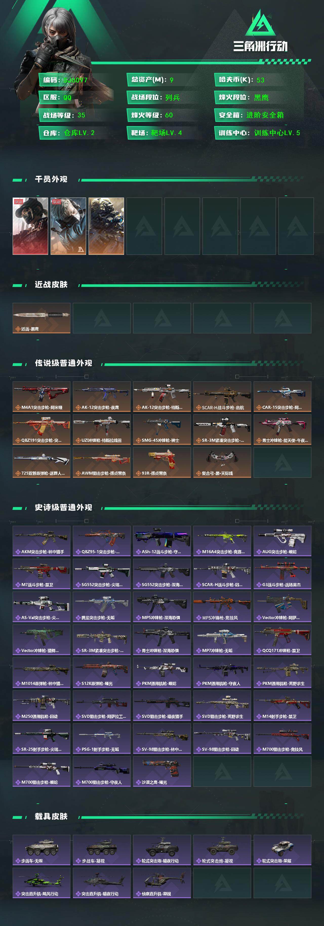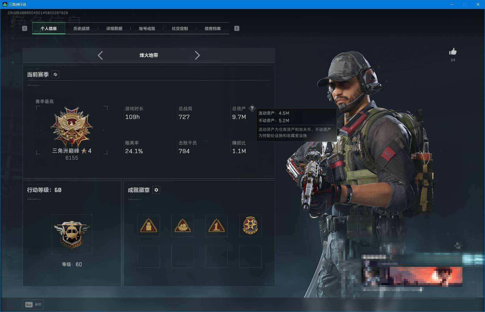 总资产(M):9M/哈夫币(K):53K/哈夫币(K):53K/全面战场等级:35_段位:列兵/烽火