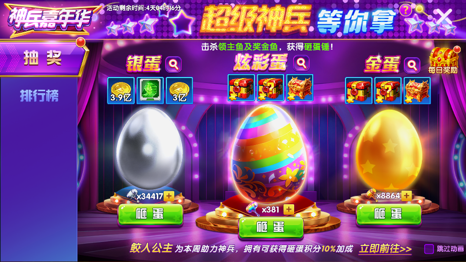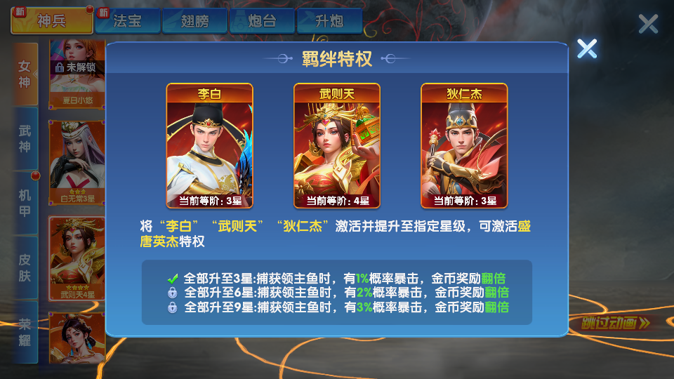 乐乐捕鱼v7文字号解绑出 55w亿金币(百倍模式下55000w亿) 限时3.2亿炮台 赠送4w多个蛋 羁绊:3阶四圣+3阶盛唐+9阶女神+9阶天王 神兵超多还有一堆神兵箱子和碎片没用 极品养老账号