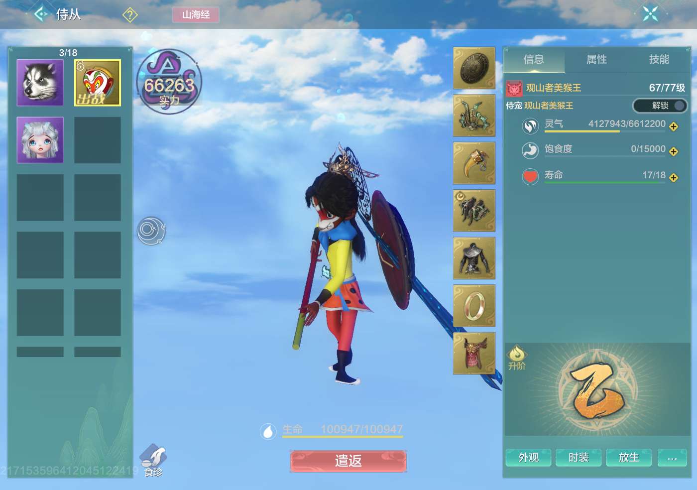 10万战力,6个五万年宠物,熊猫 霸下 睚眦 螭吻 貔貅都是五万年,有个30的海星,侍从美猴王