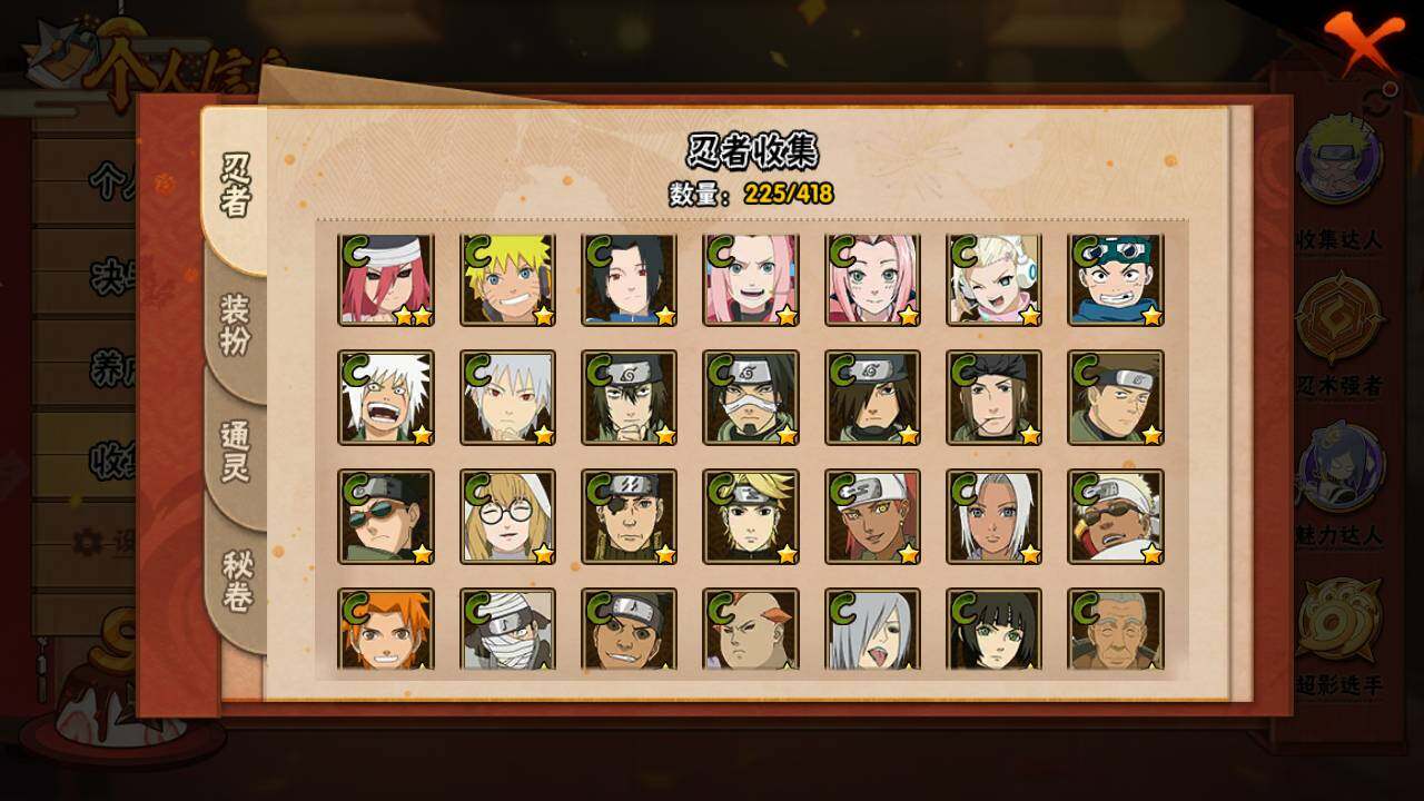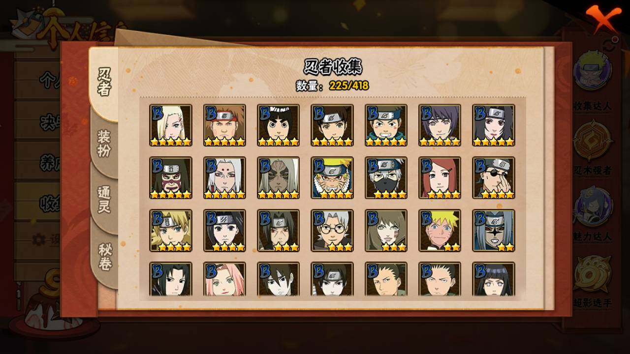 【S级忍者】:长门「秽土转生」(3星),猿飞日斩「秽土转生」(3星),宇智波斑「秽土转生·解」(3星),春野樱「忍界大战」(3星),宇智波带土「忍界大战」(3星),艾「忍界大战」(3星),宇智波鼬「须佐能乎」(3星),宇智波止水「须佐能乎」(3星),旗木卡卡西「须佐能乎」(3星),宇智波斑