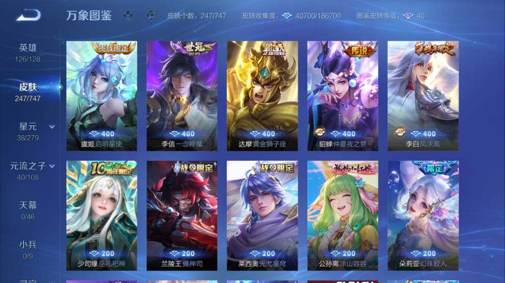 安卓Q-V8-247皮肤-1典藏皮肤-1无双-4珍品传说-19传说-77史诗-