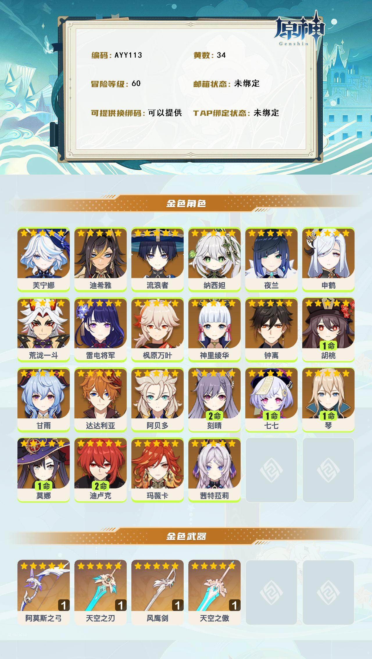 60级/34黄/男主/22个五星角色/4个五星武器0命芙宁娜,0命迪希雅,0
