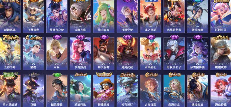 【限定皮肤】:狄仁杰阴阳师,高渐离玩趣恶龙,达摩沙漠行僧,项羽海滩派对,韩信傲雪梅枪,李元芳云中旅人,鬼谷子五谷丰年,沈梦溪大漠名商,裴擒虎擒涛扼浪,上官婉儿梁祝,鲁班大师探海日志,桑启海盐诗旅,阿古朵江河有灵,张良古海寻踪,鬼谷子天穹祈