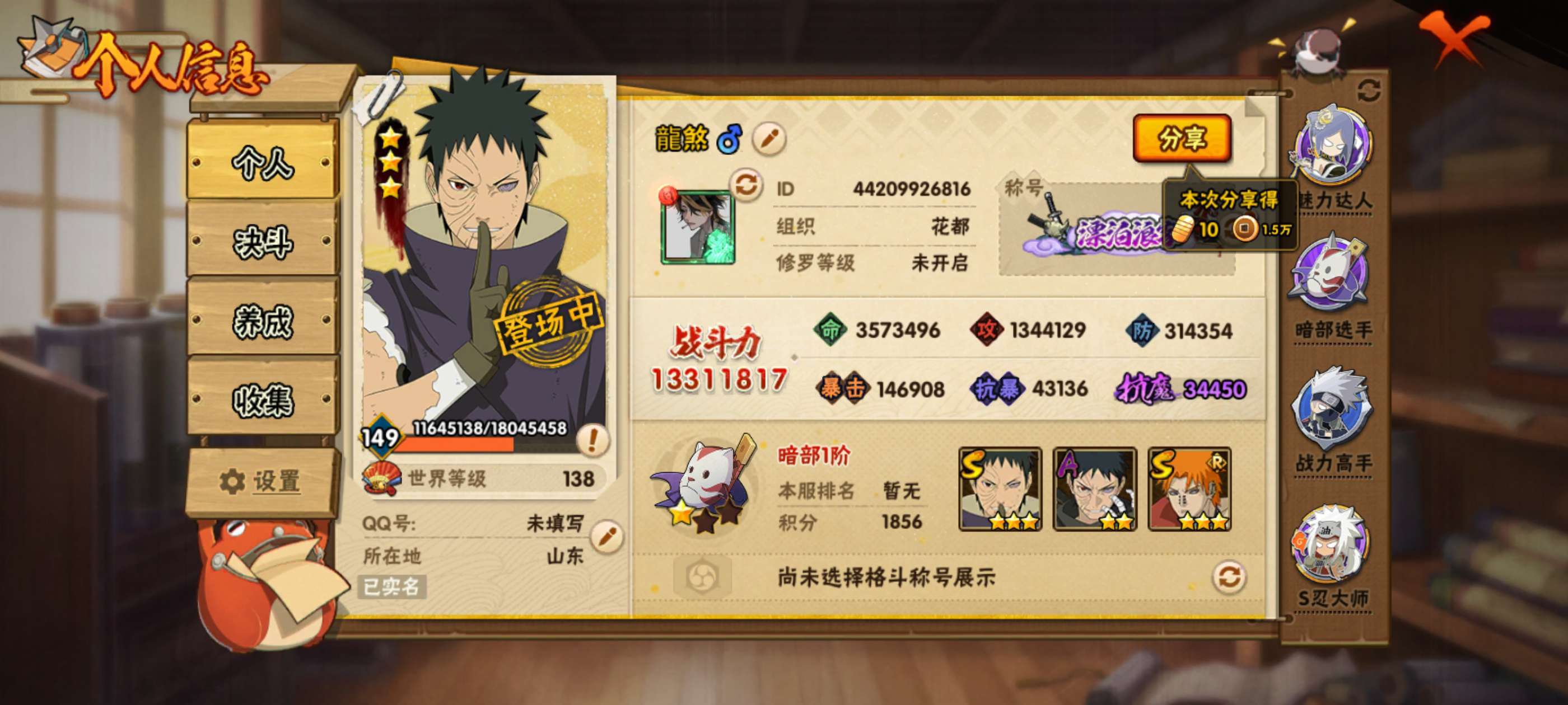 V13 1336万战力 36S-58A 金币1.1万 有熊猫 传说自来也75片