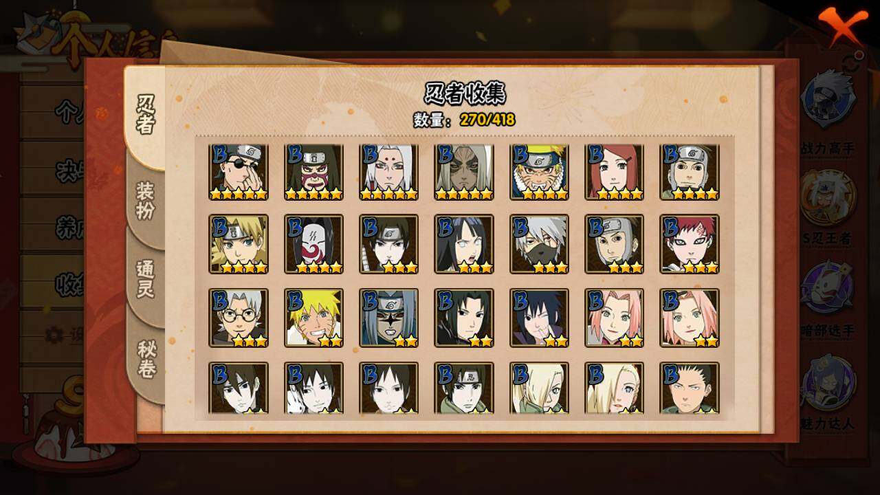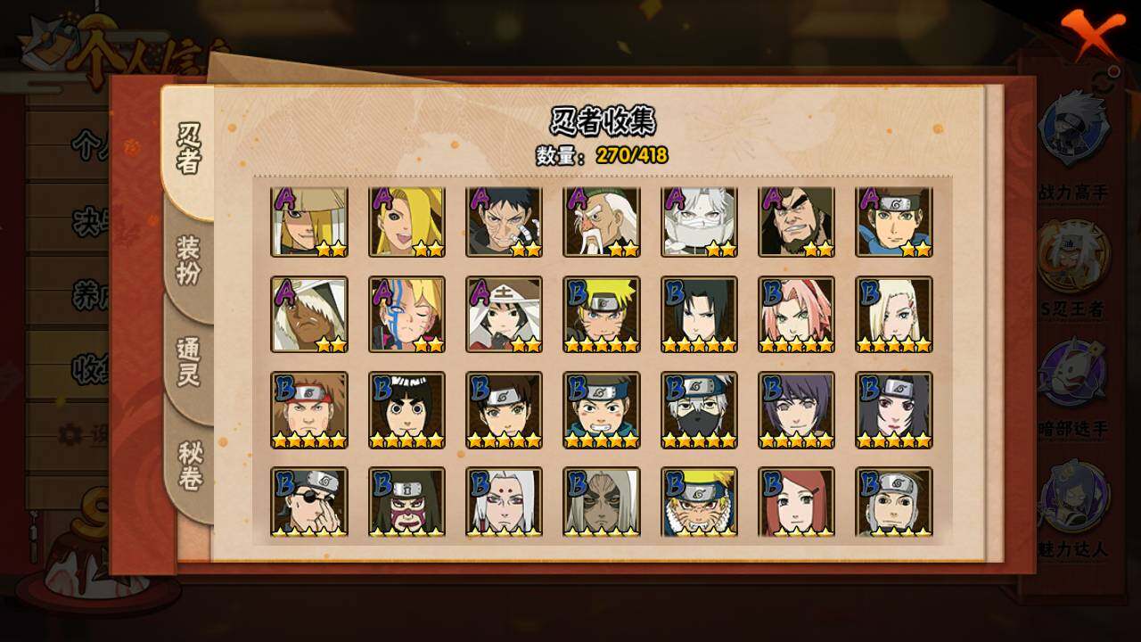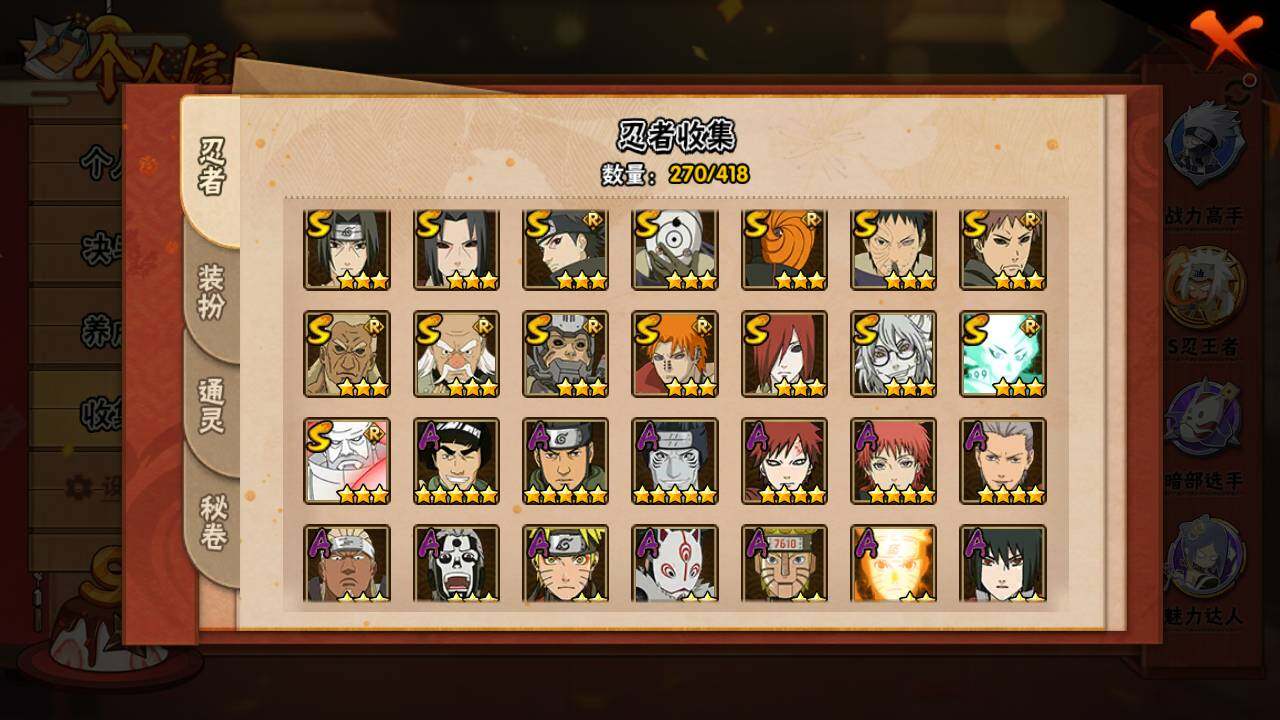 【S级忍者】:长门「秽土转生」(3星),半藏「秽土转生」(3星),猿飞日斩「秽土转生」(3星),波风水门「秽土转生」(3星),千手扉间「秽土转生」(3星),千手柱间「秽土转生」(3星),宇智波鼬「秽土转生」(3星),宇智波斑「秽土转生」(3星),大野木「忍界大战」(3星),春野樱「忍界大战」(3星),宇