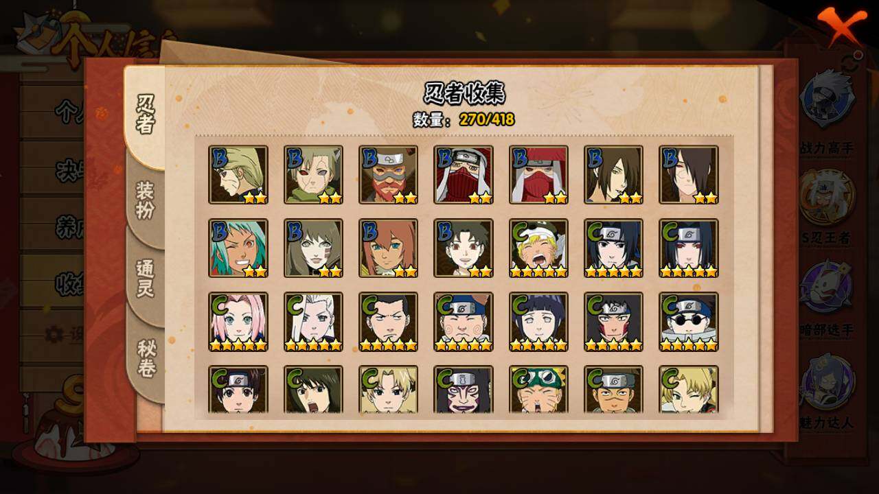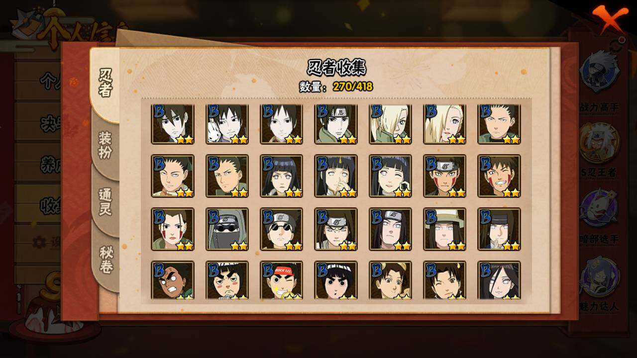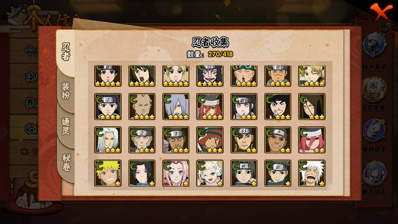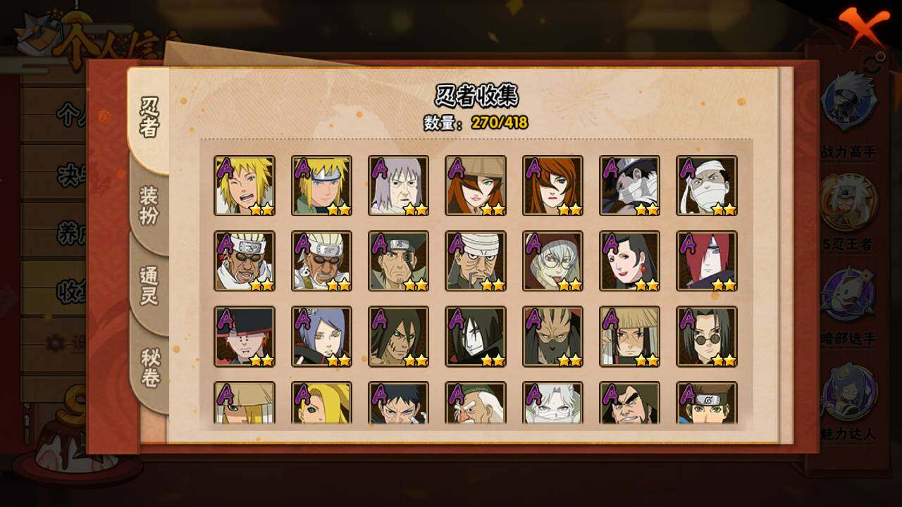 【S级忍者】:长门「秽土转生」(3星),半藏「秽土转生」(3星),猿飞日斩「秽土转生」(3星),波风水门「秽土转生」(3星),千手扉间「秽土转生」(3星),千手柱间「秽土转生」(3星),宇智波鼬「秽土转生」(3星),宇智波斑「秽土转生」(3星),大野木「忍界大战」(3星),春野樱「忍界大战」(3星),宇