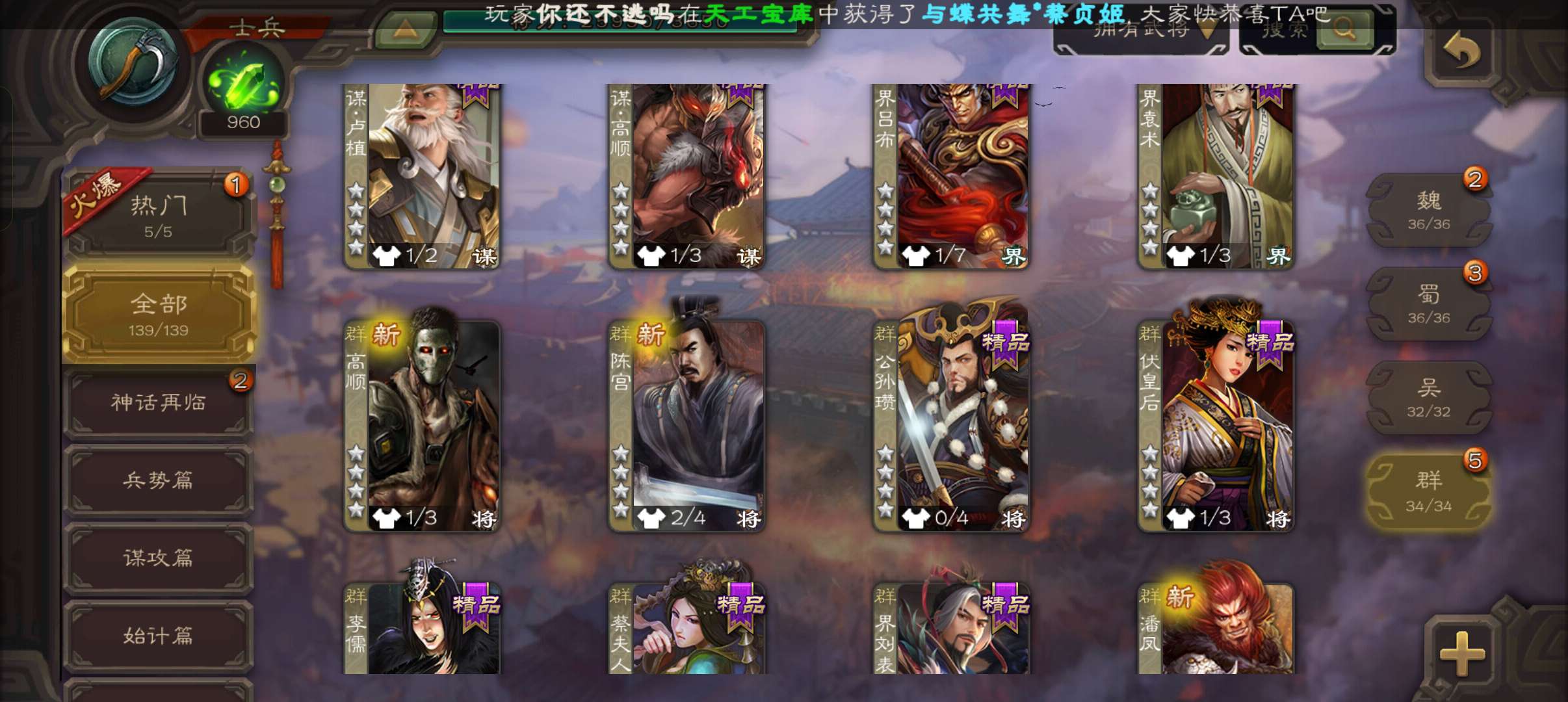超级狗托士兵,135宝珠8万羽毛7万豆,回廊动白马神吕布界钟会,动张鲁谋高顺谋卢植霍峻界权139将