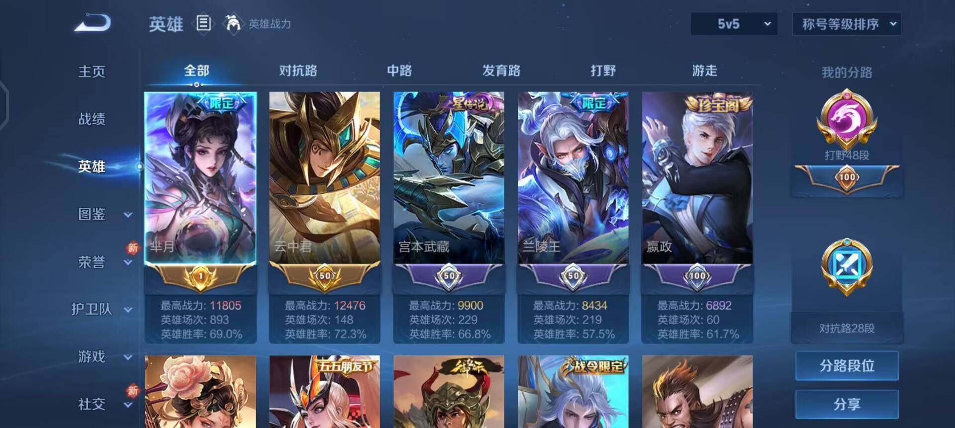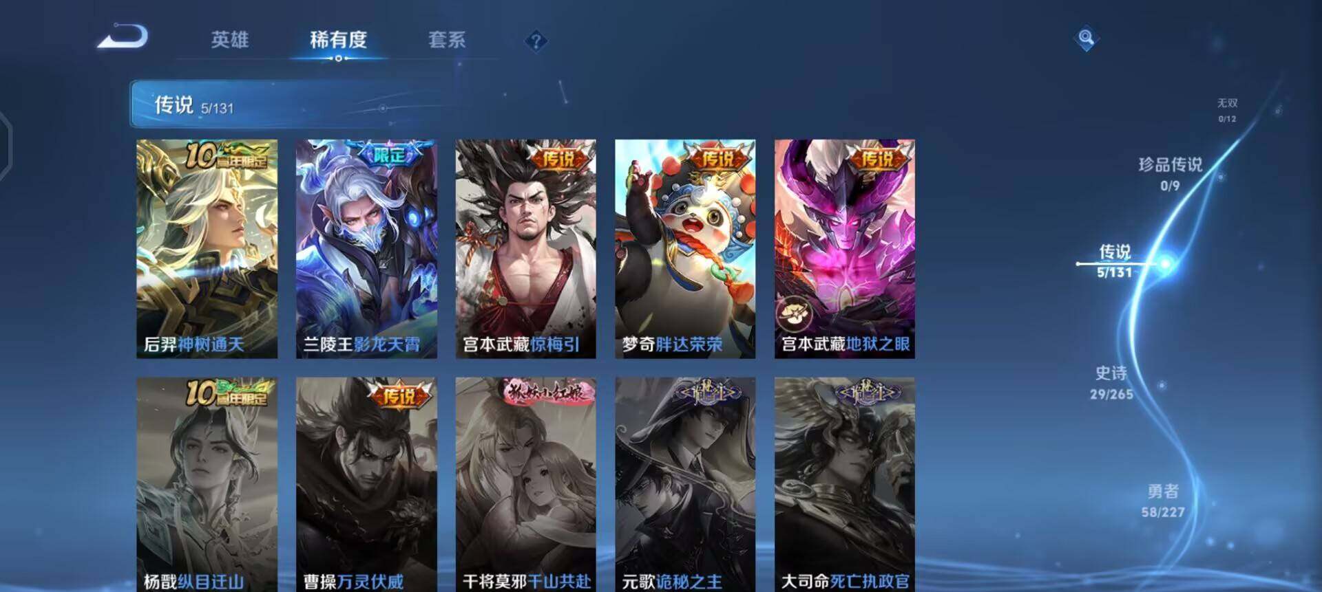 【传说皮肤】:后羿神树通天,兰陵王影龙天霄,宫本武藏惊梅引,梦奇胖达荣荣,宫本武藏地狱之眼