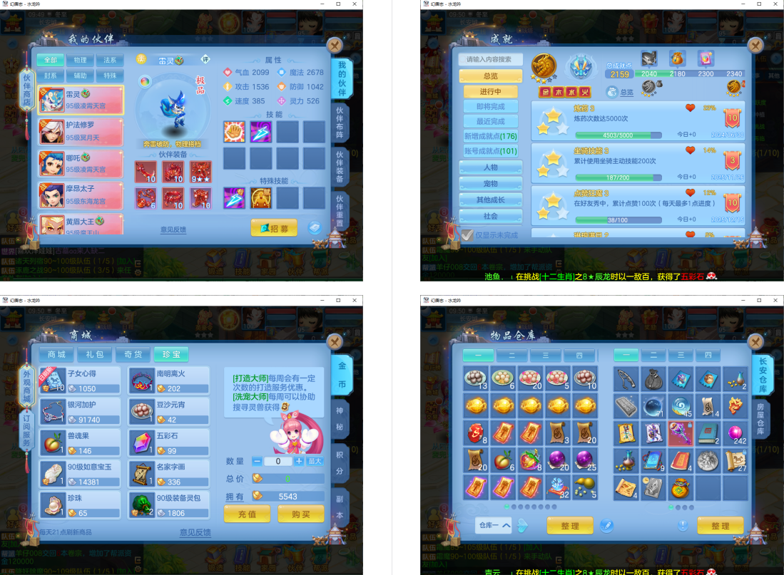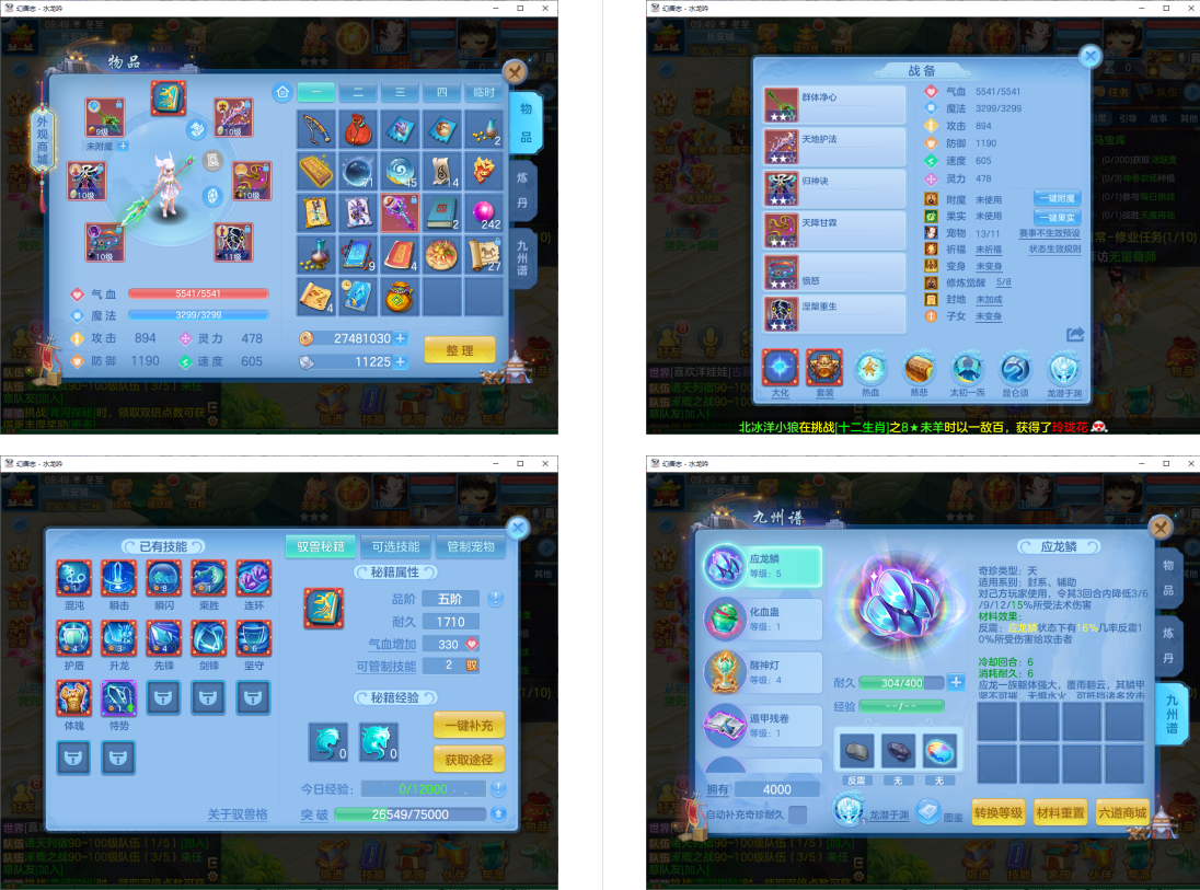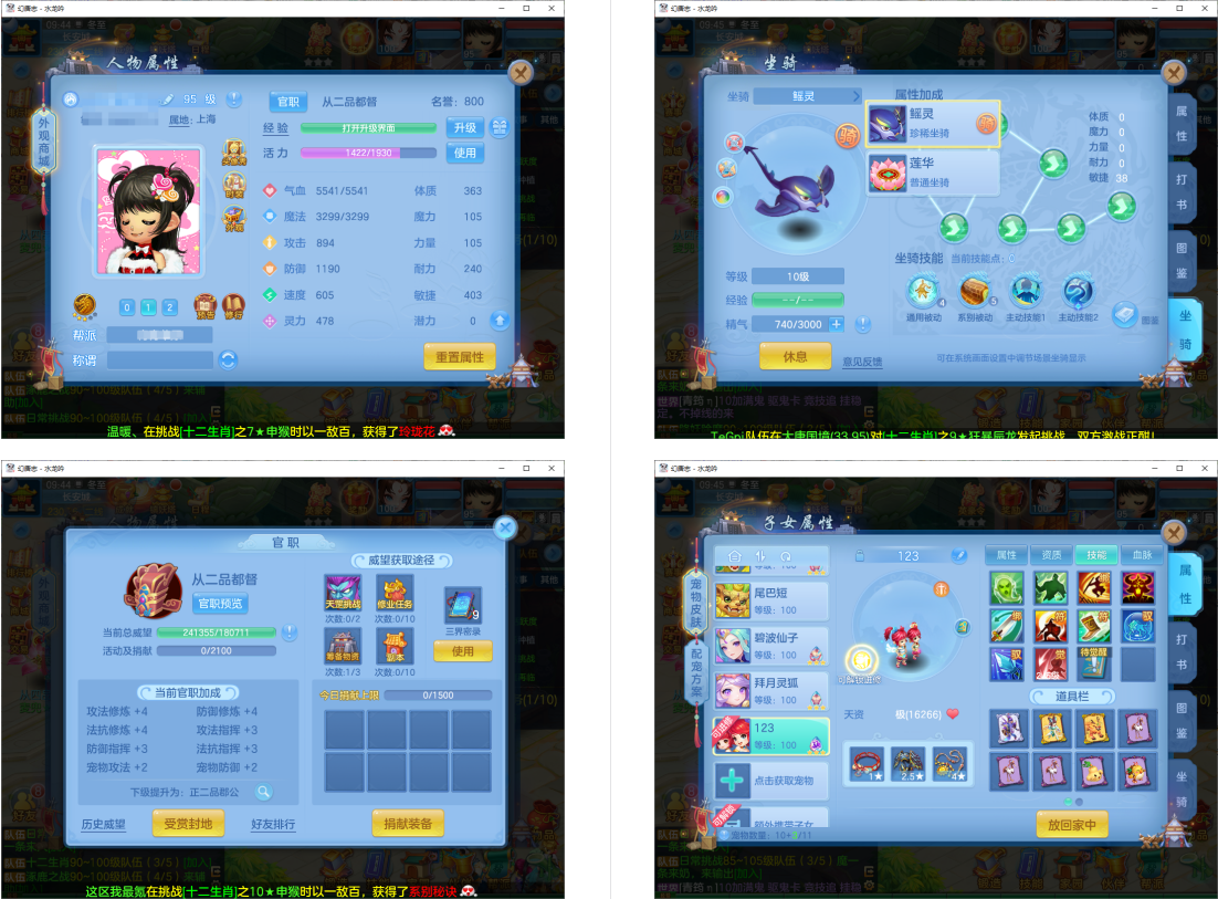 (95小丹山/女)(7天换绑)水龙呤--1件11段4件10段1件9段,双满魂仙兽+5神兽4内丹神兽+2珍兽+4个6多他是,有金拍庄园,还有5500金子,仓库还有不少资源