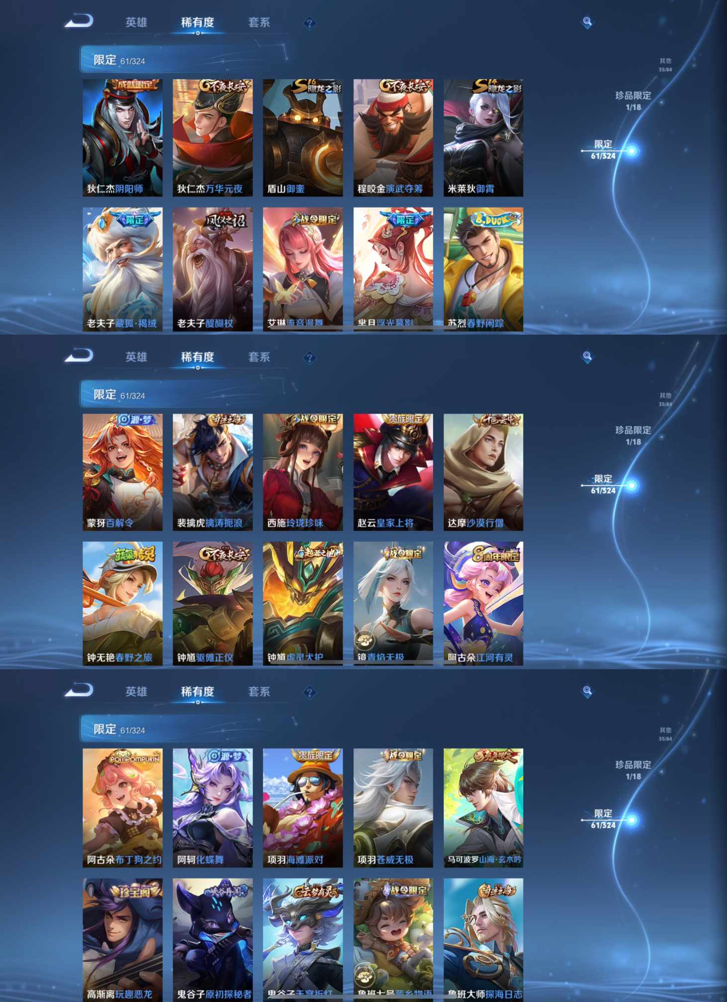 【史诗皮肤】 蔬乡物语 蔬乡物语 冰霜恋舞曲 冰锋战神 布丁狗之约 谧流熔炉 电玩小子 群星魔术团 至尊宝 孙行者 龙之律动 地狱燃心 山海·玄木吟 青焰无极 浮光幕影 苍威无极 王牌新星 聚星闪耀 江河有灵 百解令 藏狐·褐绒 化蝶舞 玉兔公主 星界游