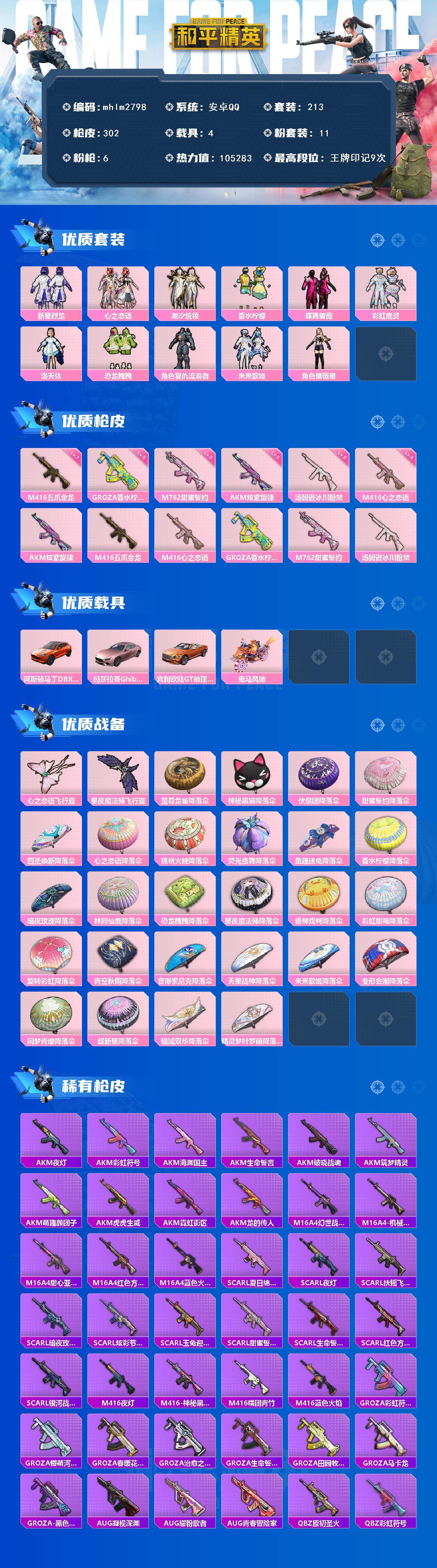 【mhlm2798】安卓 手Q-11粉装-6特效枪-4载具-2粉色飞行器-105283热力值-9王牌印记-213套装-302枪皮
