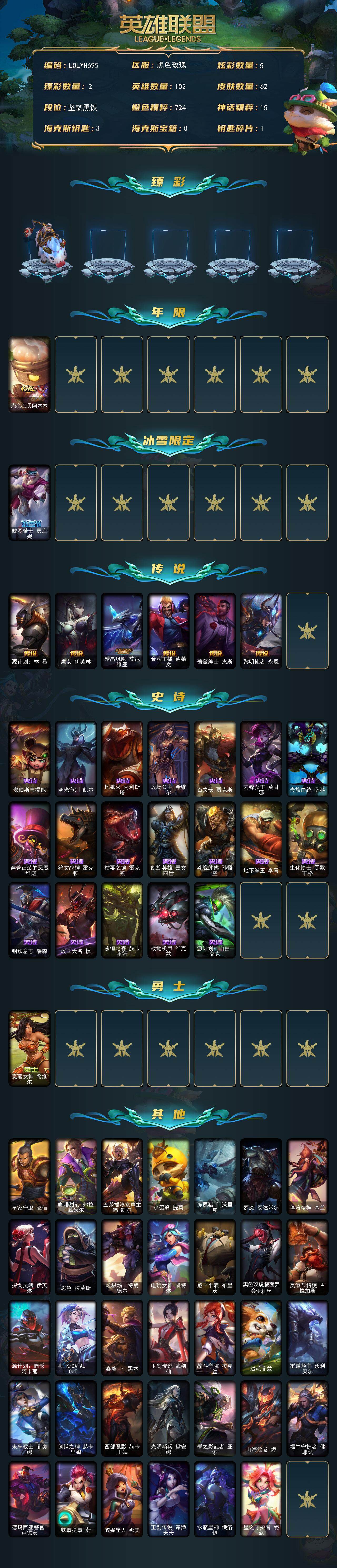 【LOLYH695】102英雄/62皮肤/2限定/2臻彩/5炫彩/6传说/19史诗/未定级/无畏骑士瑟庄妮赤子初心/星之守护者阿卡丽热情之光/点心宝贝阿木木/魄罗骑士瑟庄妮/源计划林易/魔女伊芙琳/黯晶凤凰艾尼维亚/金牌主播德莱文/蔷薇绅士杰斯/黎明使者永恩/安伯斯与提妮/圣光审判凯尔/地狱火阿利斯塔/战场公主希维尔/百夫长贾克斯/刀锋女王莫甘娜/贵族血统萨科/穿着正装的恶魔维迦/符文战神雷克顿/枯萎之壤雷克顿/凯旋英雄嘉文四世/斗战胜佛孙悟空/地下拳王李青/生化博士黑默丁格/钢铁意志潘森/战国