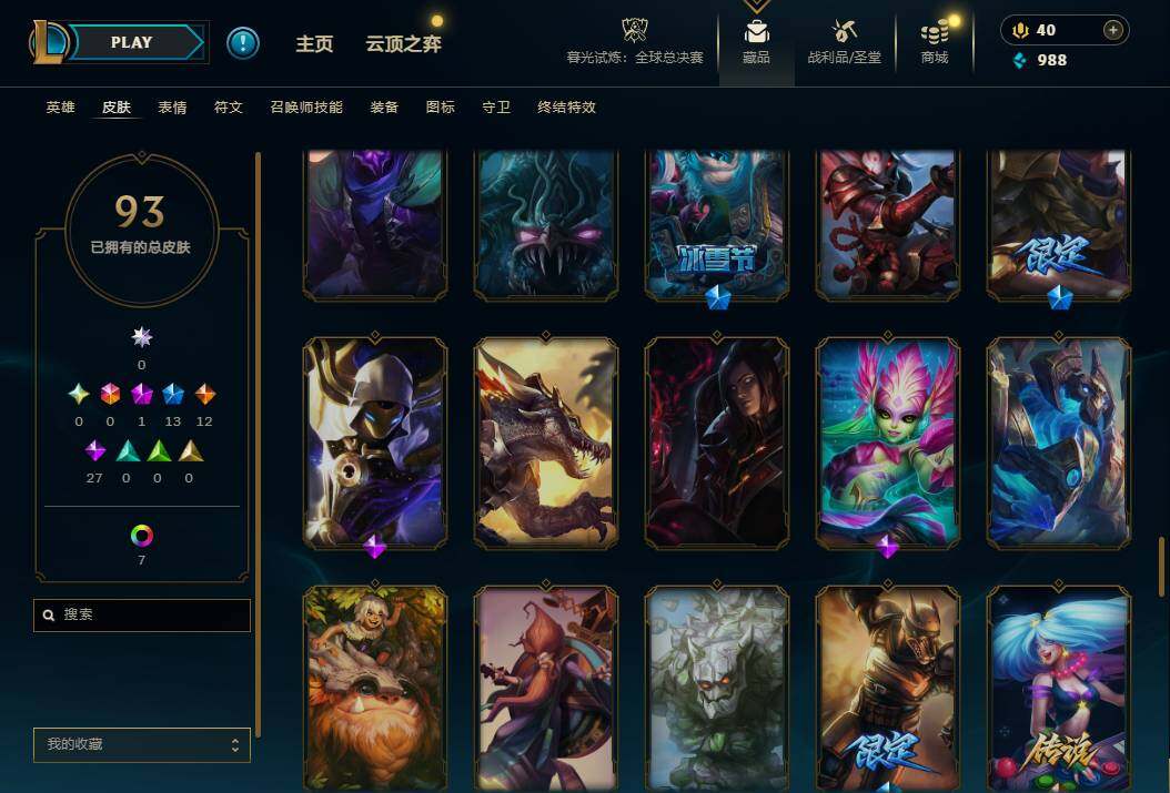 154英雄/93皮肤/1神话/13限定/10炫彩/12传说/27史诗/未定级/