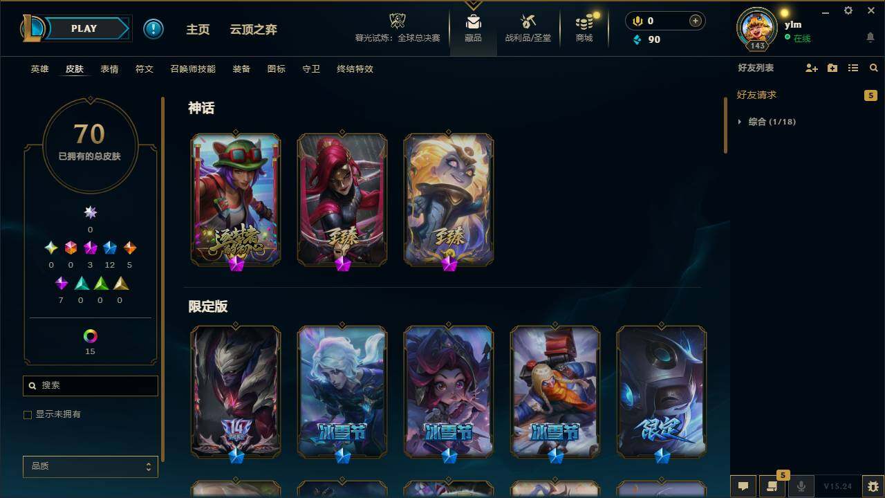 170英雄/70皮肤/3神话/12限定/6臻彩/25炫彩/5传说/7史诗/铂金/