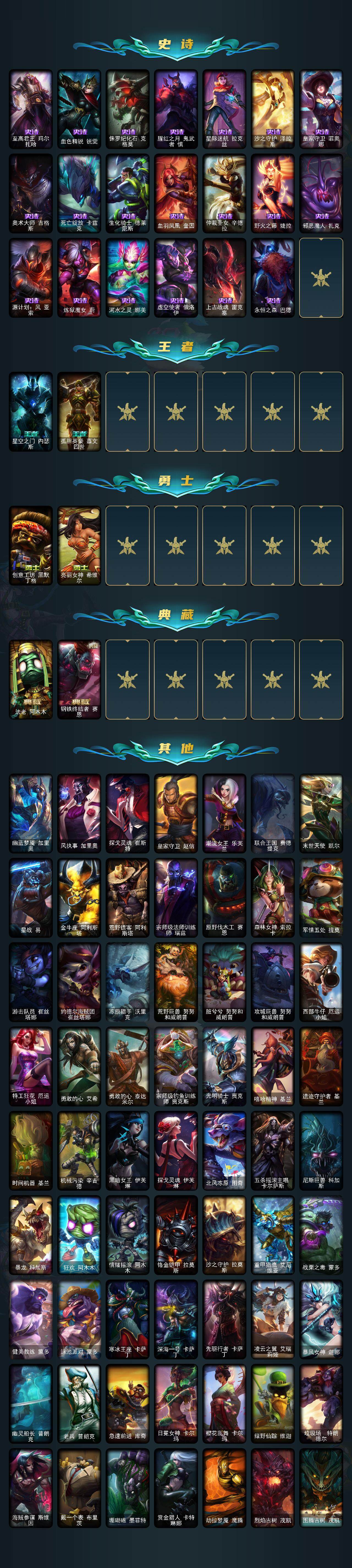 151英雄/213皮肤/1终极/1神话/26限定/2臻彩/4炫彩/9传说/55史诗