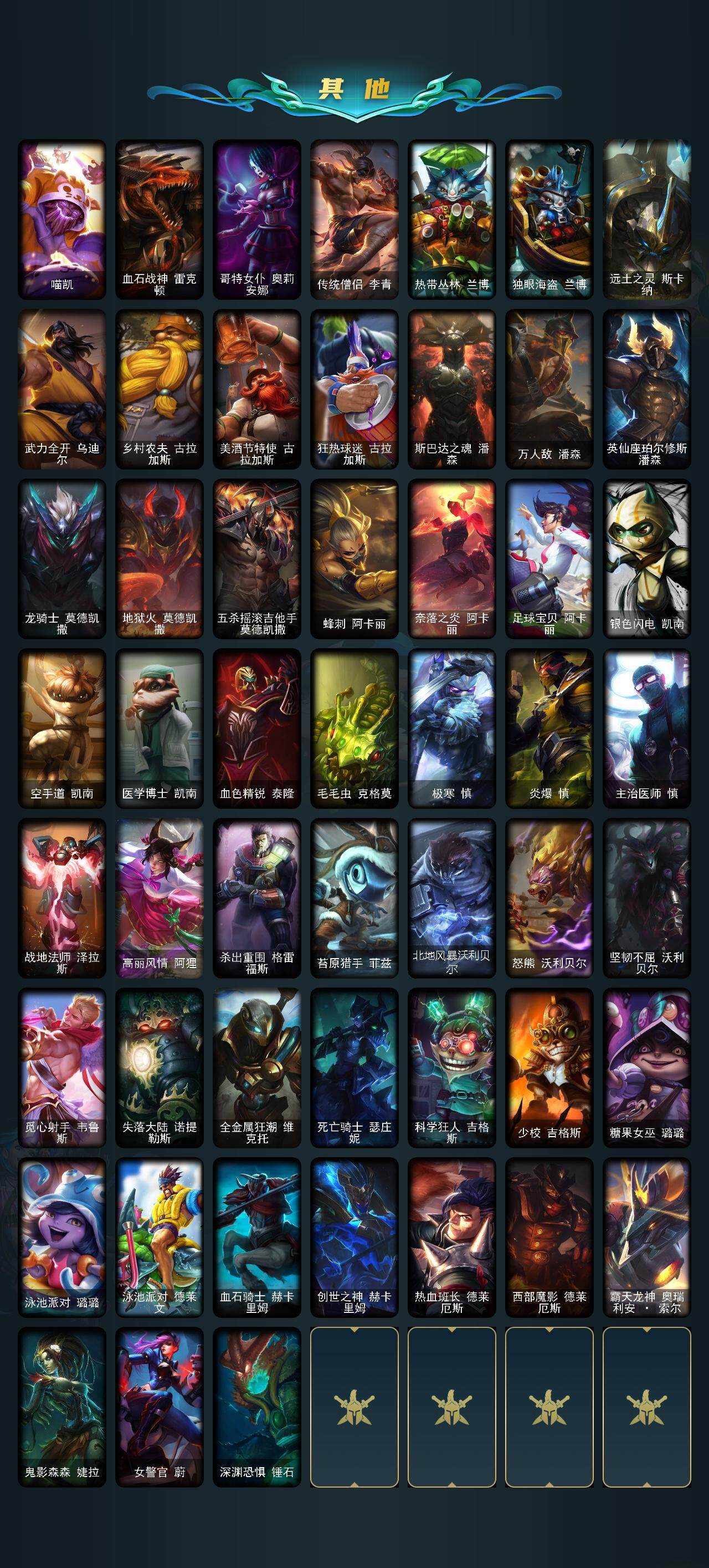 【LOLYH704】151英雄/213皮肤/1终极/1神话/26限定/2臻彩/4炫彩/9传说/55史诗/未定级/最终BOSS维迦里大魔王/碧玉之牙卡西奥佩娅/神龙烈焰金克丝/幸福女神乐芙兰/平安夜女神娑娜/冬季仙境卡尔玛/雪默丁格/雪装奈德丽/圣诞玩偶波比/未来战士伊泽瑞尔/十周年纪念安妮/暗杀星慎/SKTT1劫/SKTT1婕拉/SKTT1瑞兹/海贼瑞兹/南瓜头费德提克/机械迷城加里奥/蓝色忧郁崔斯特/蒙多蒙多/女猎手希维尔/暗影沃里克/野兽猎人瑟庄妮/波比的巧克力工坊/勇者阿狸/御星魔矢艾希/