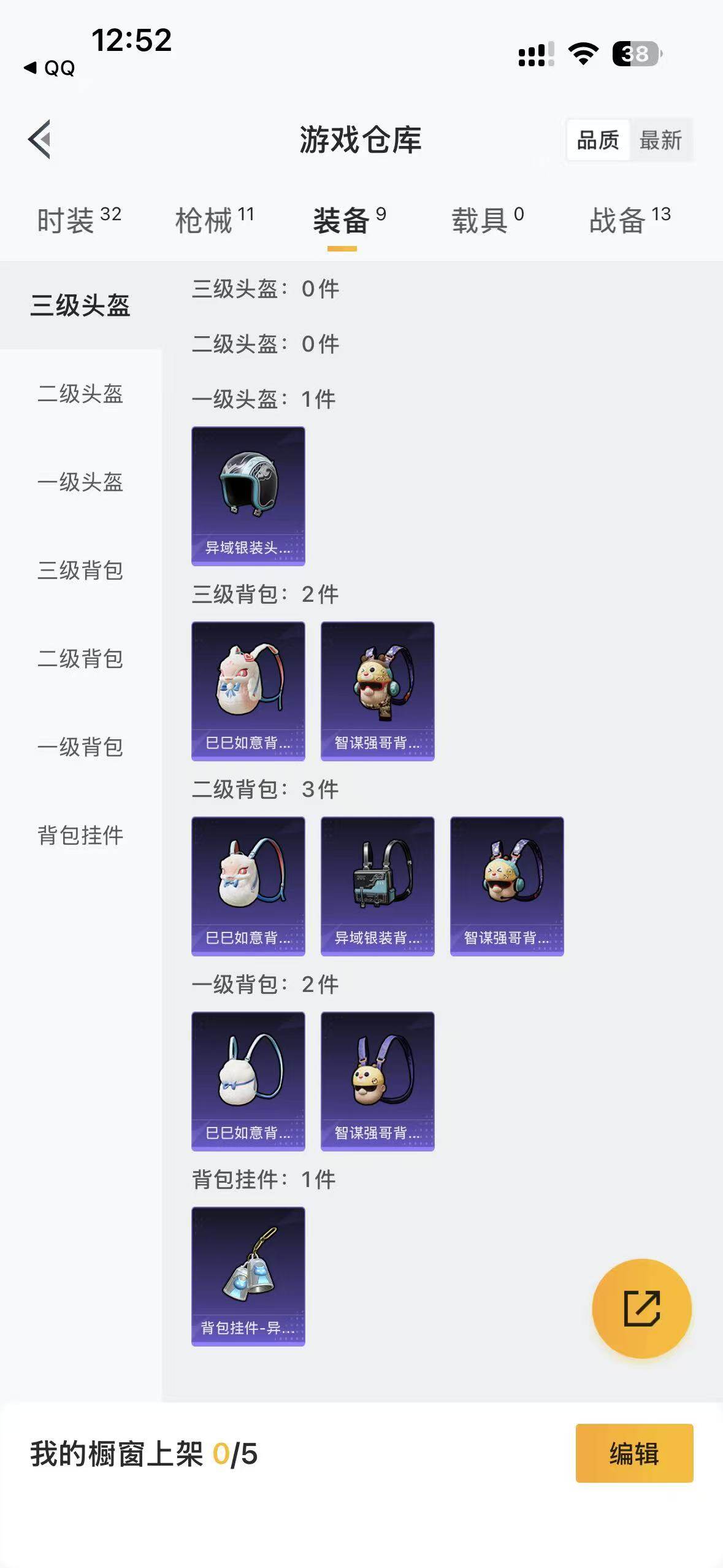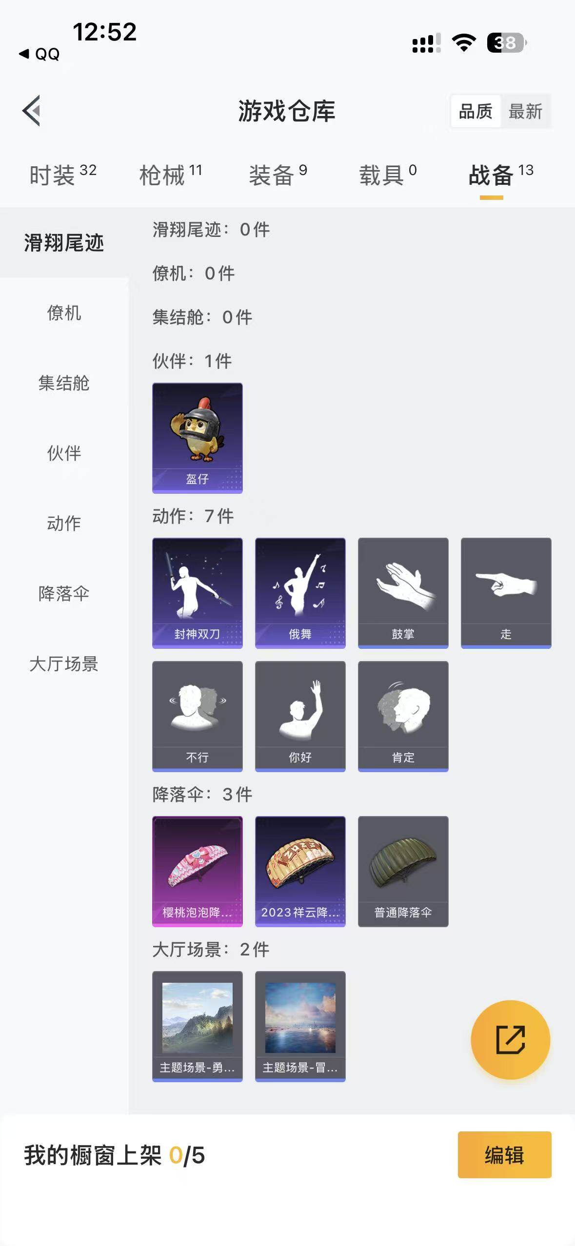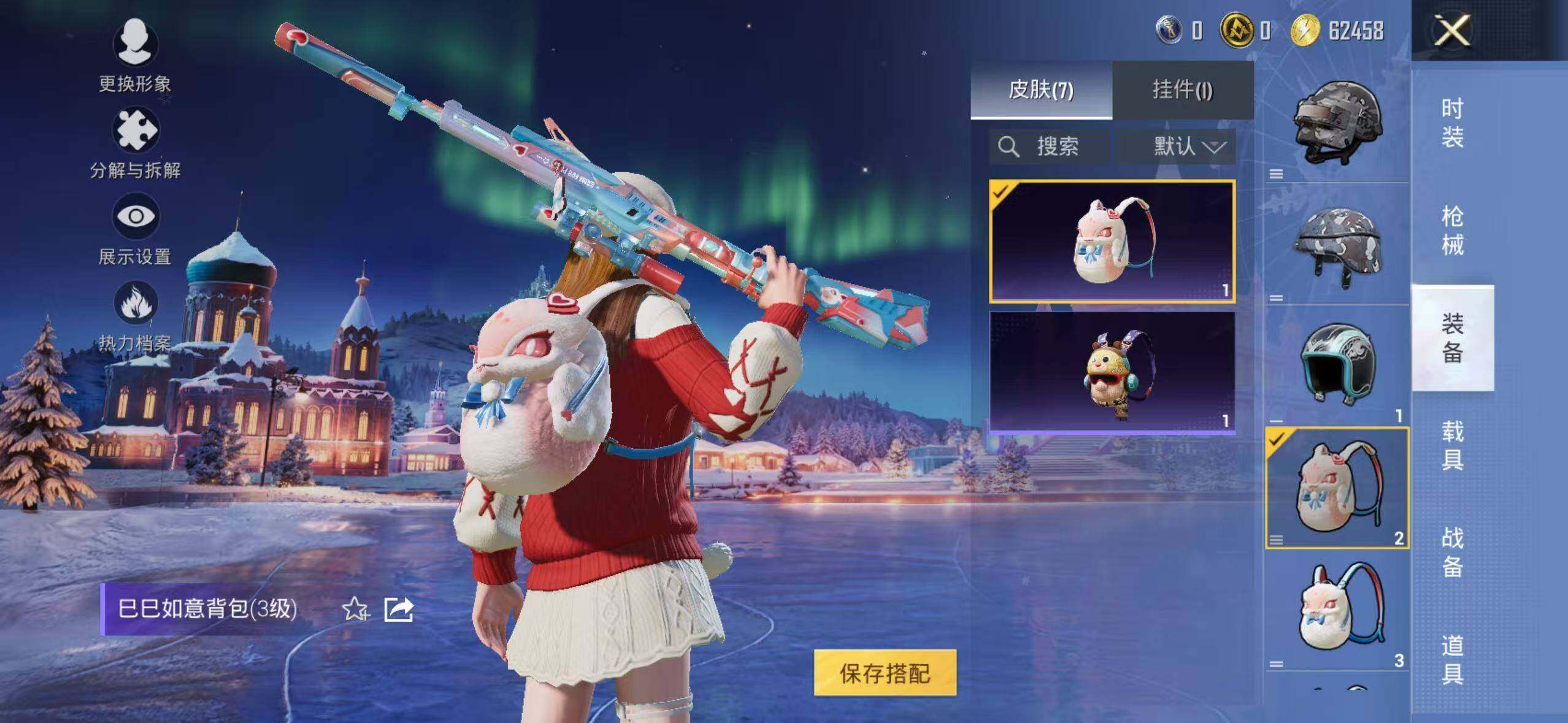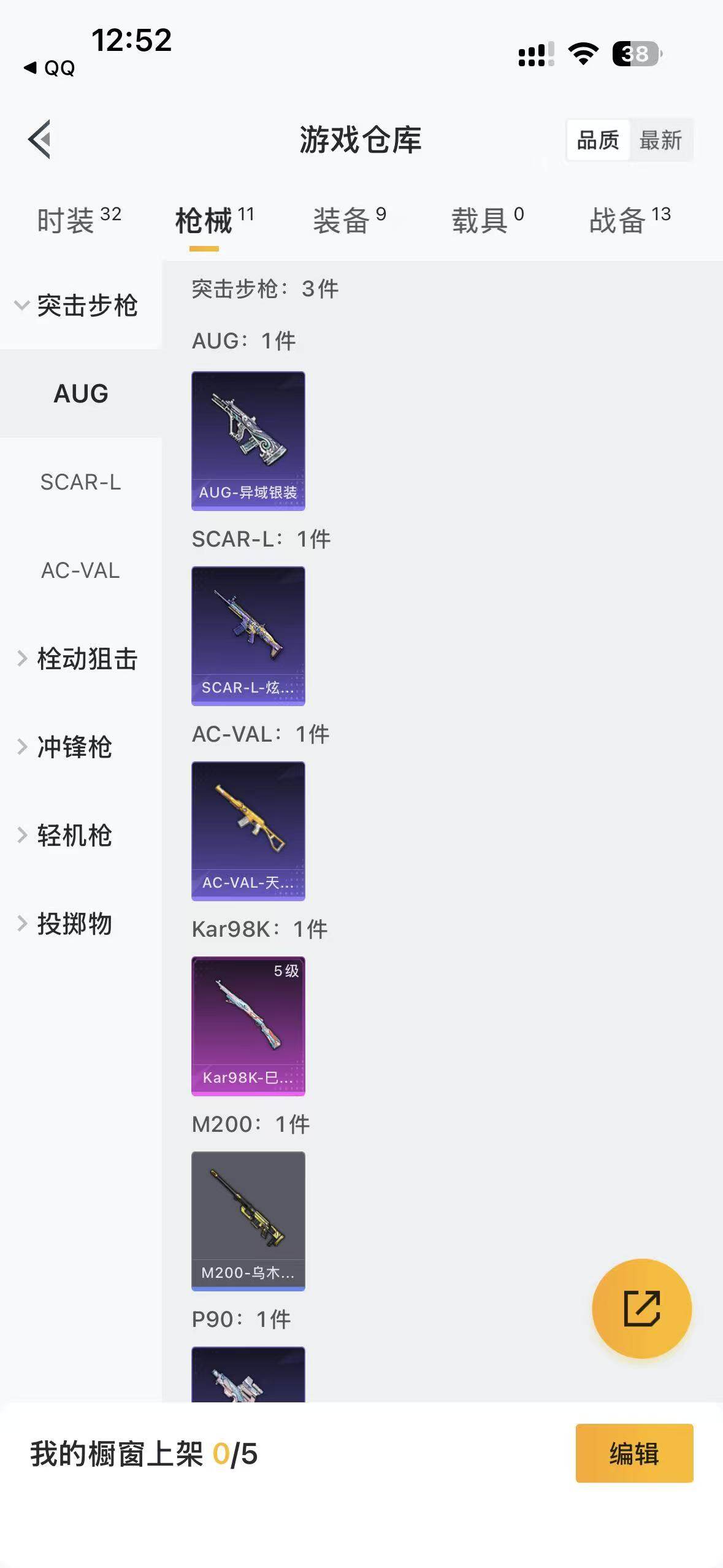 5套装/枪械1/装备9/战备13/热力值2630/五级Kar98K-巳巳如意/Kar98K-巳巳如意/樱桃泡泡降落伞/SCAR-L-炫彩节奏/AC-VAL-天降萌叽/UZI-天降萌叽/P90-巳巳如意/MG3-幻世战舞者/破片手榴弹-巳巳如意/鹤鸣