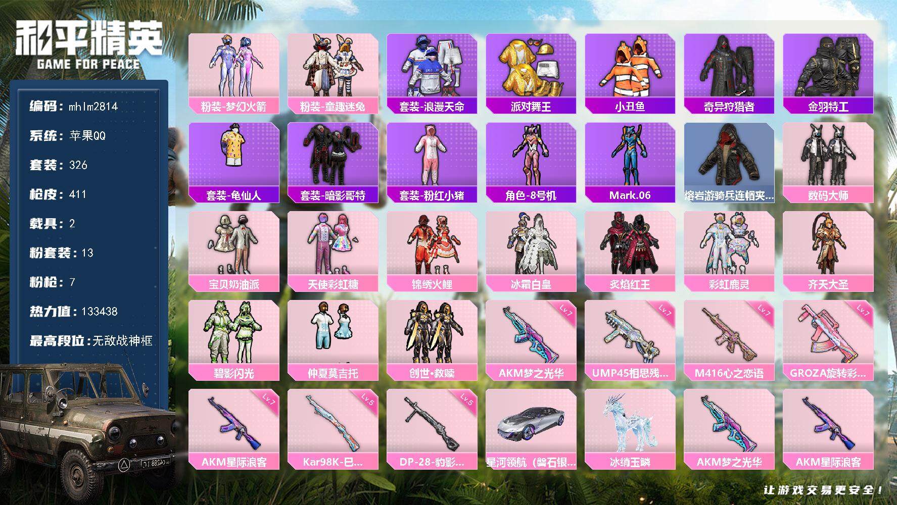 【mhlm2814】苹果 手Q-无敌战神框-13粉装-7特效枪-2载具-6粉色飞行器-133438热力值-22王牌印记-326套装-411枪皮