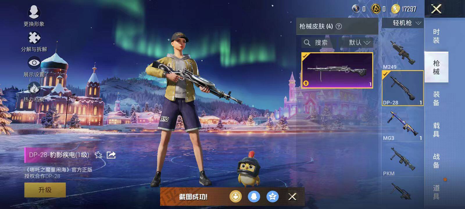 2套装/枪械1/装备5/战备11/热力值1026/一级DP-28-豹影疾电/DP-28-豹影疾电/UZI-影袭/MG3-幻世战舞者/绮丽涂鸦/黄色运动
