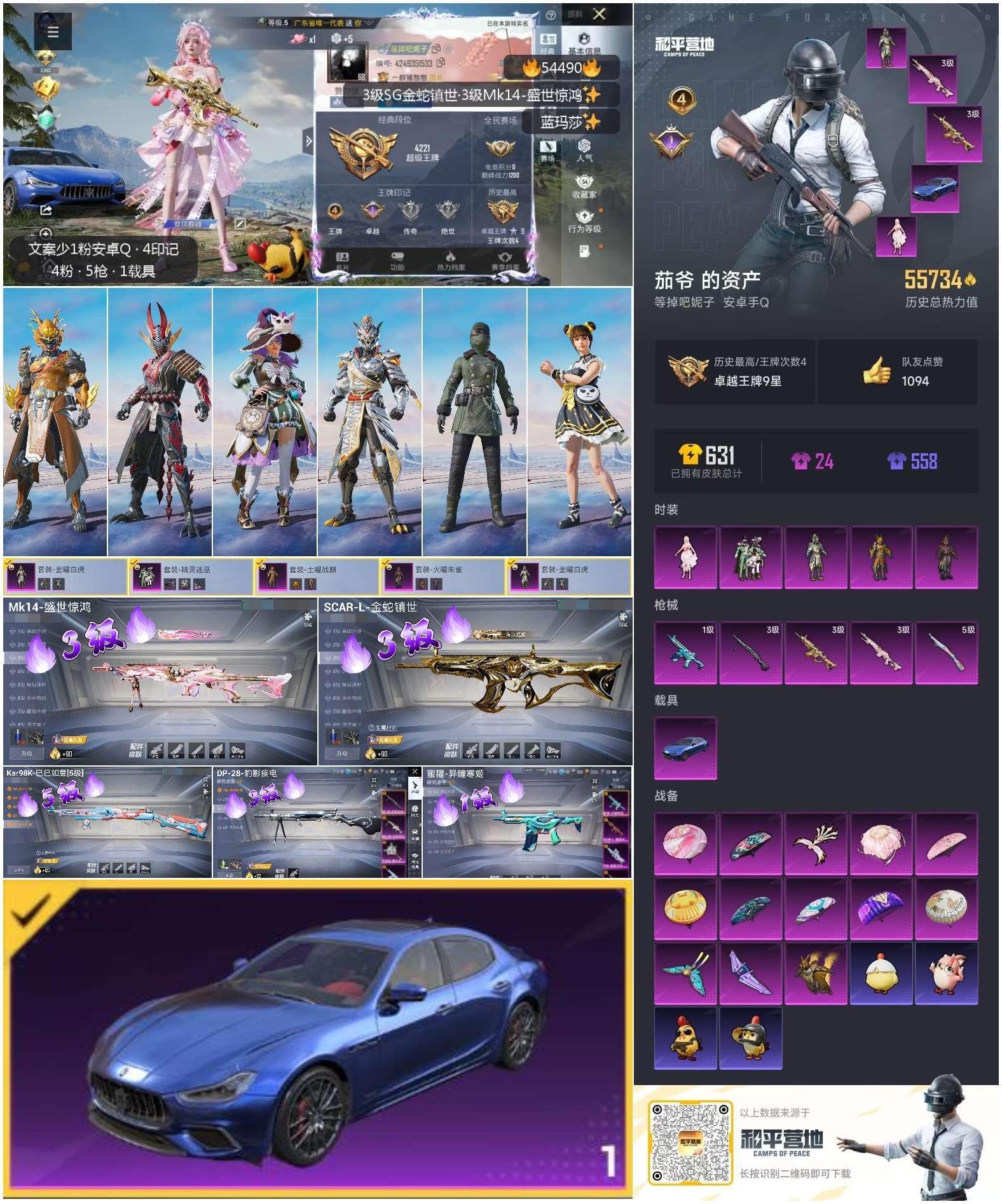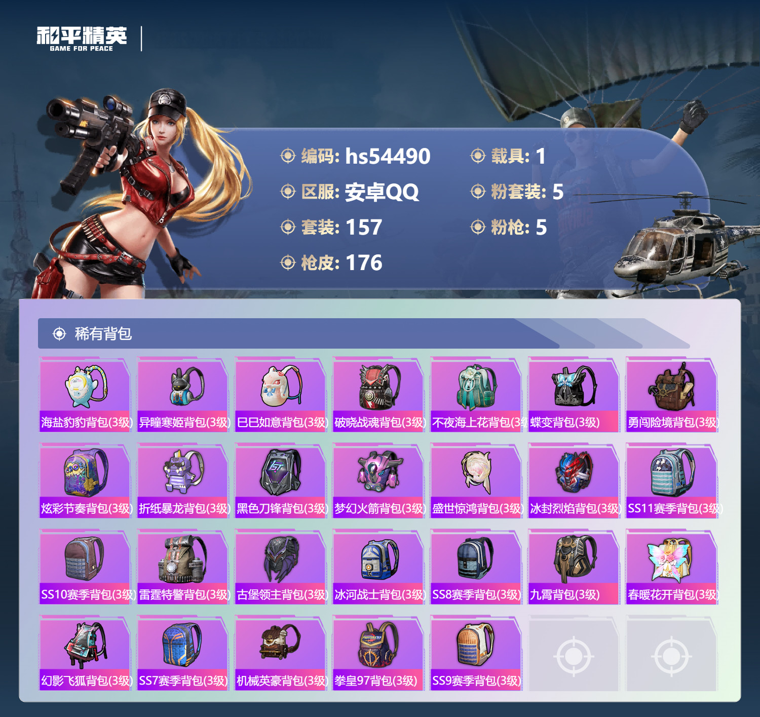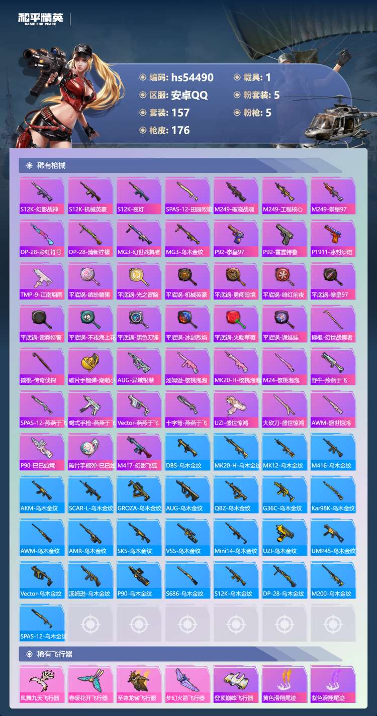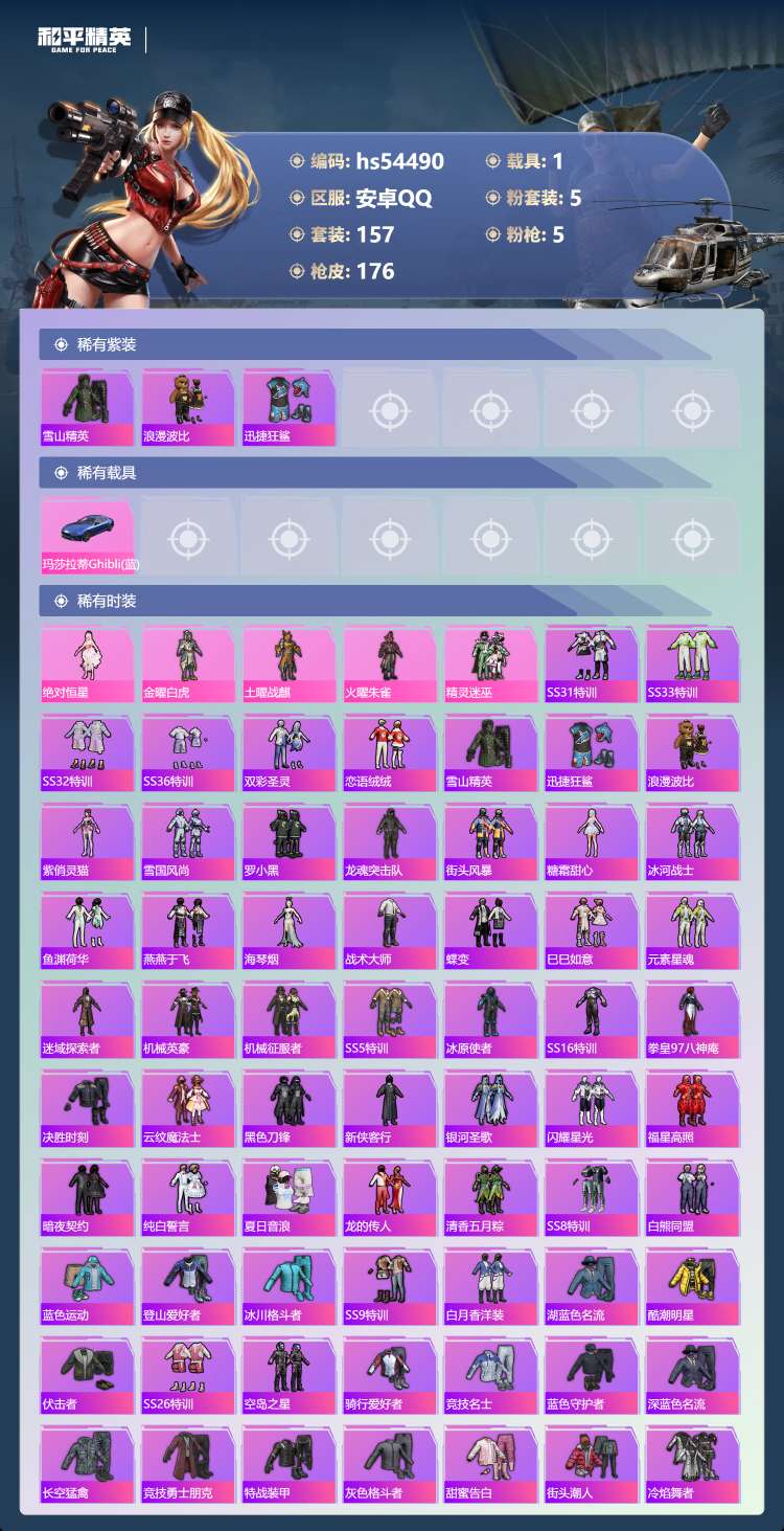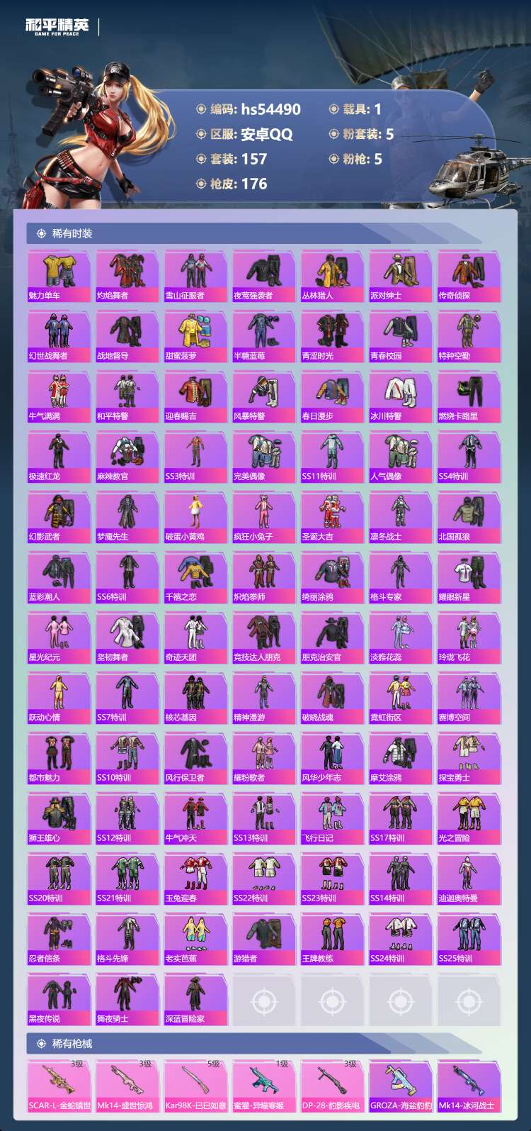 hs54490 安卓手Q-4王牌印记-5粉装-5特效枪-1载具-55734热力值-157套装-176