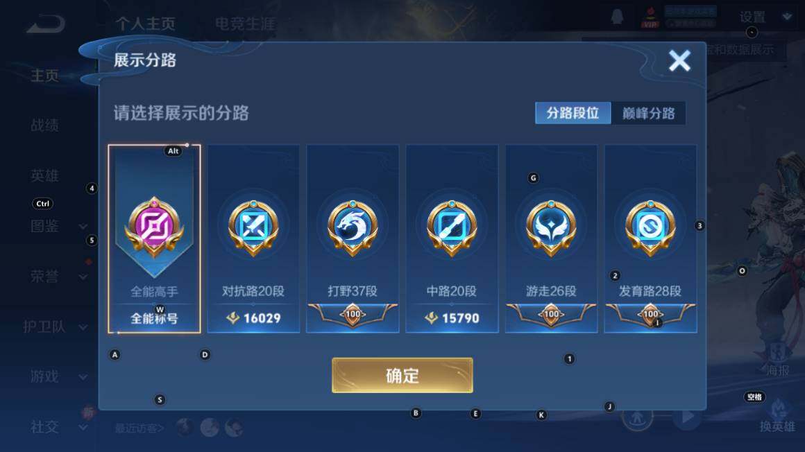 2金标,5星传说,打野37段,发育28段,游走26段,对抗中路20段,34按键
