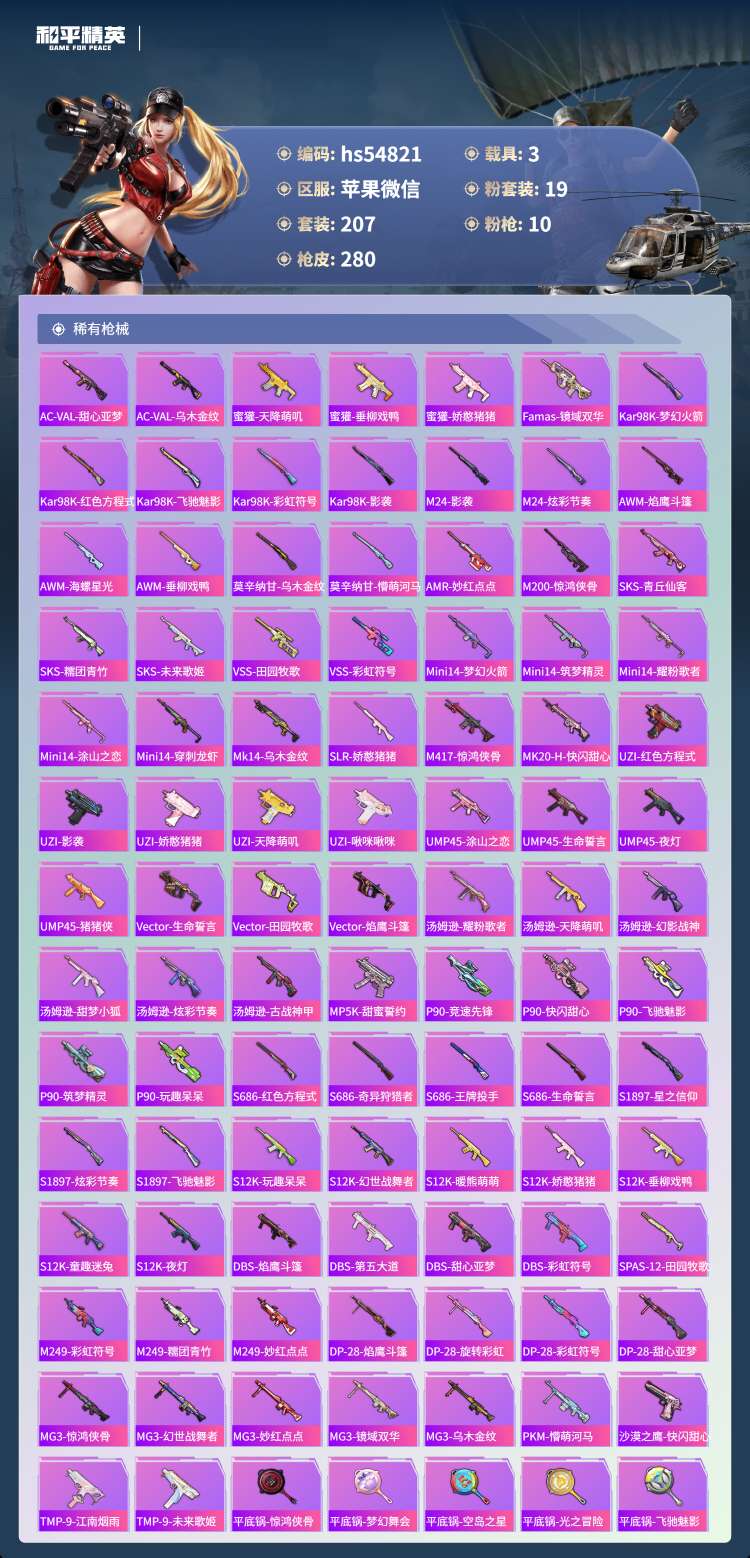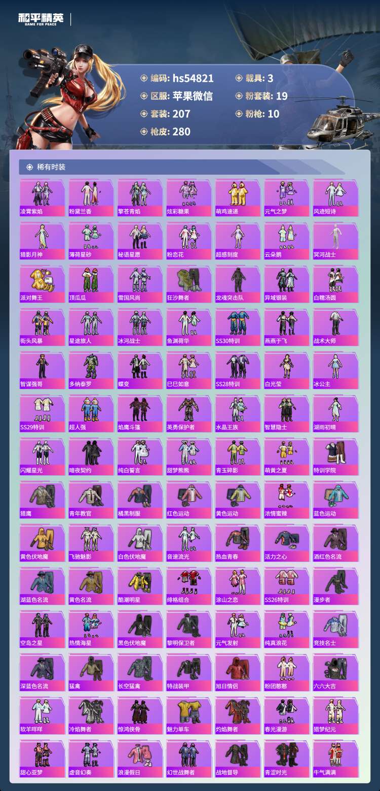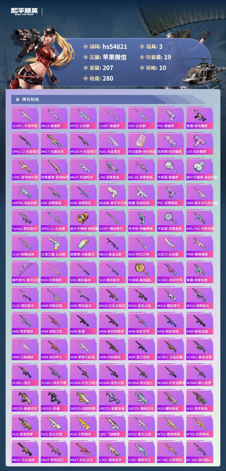 hs54821 苹果微-16王牌印记-1红装-19粉装-10特效枪-3载具-105652热力值-2