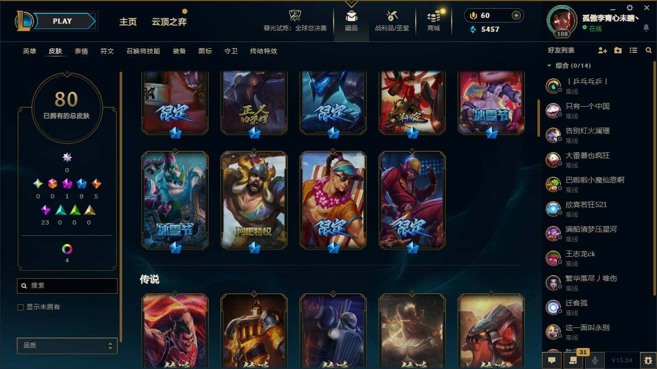 95英雄/80皮肤/1神话/9限定/6炫彩/5传说/23史诗