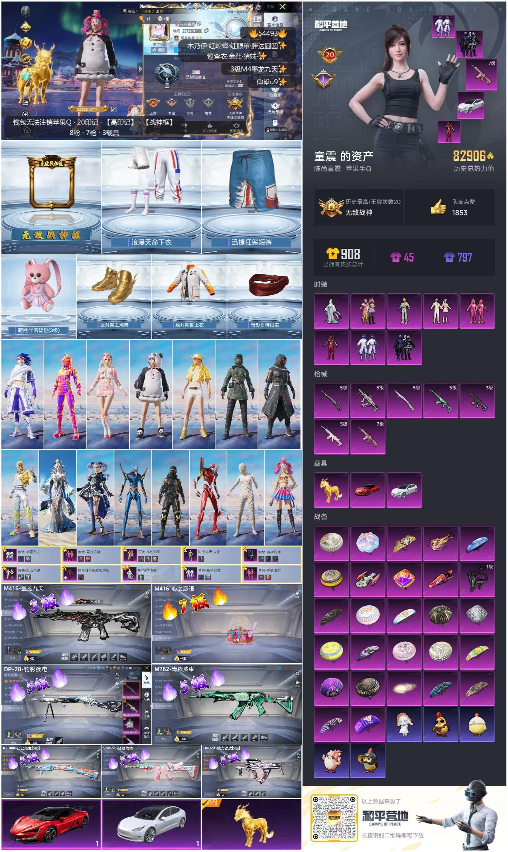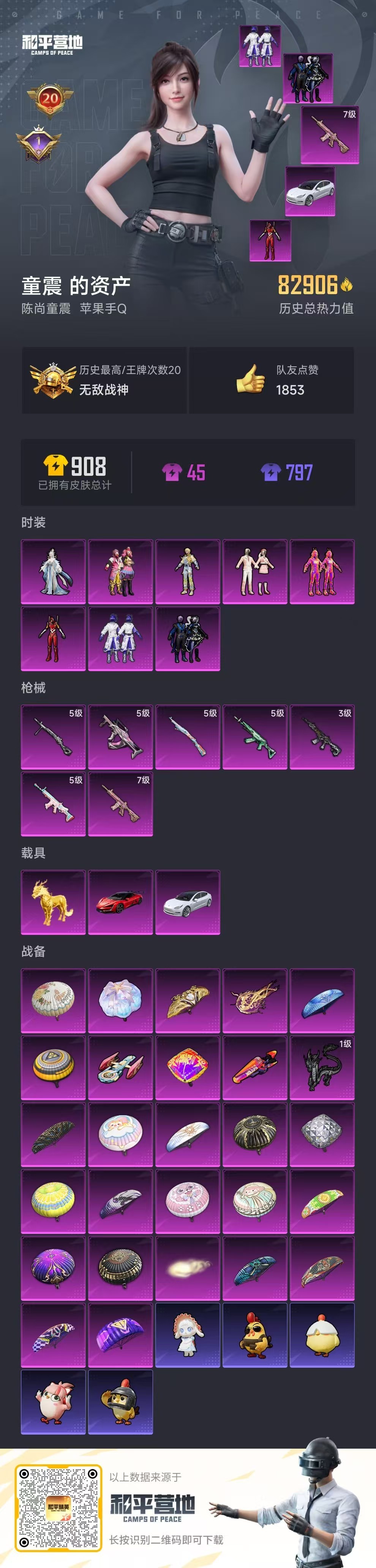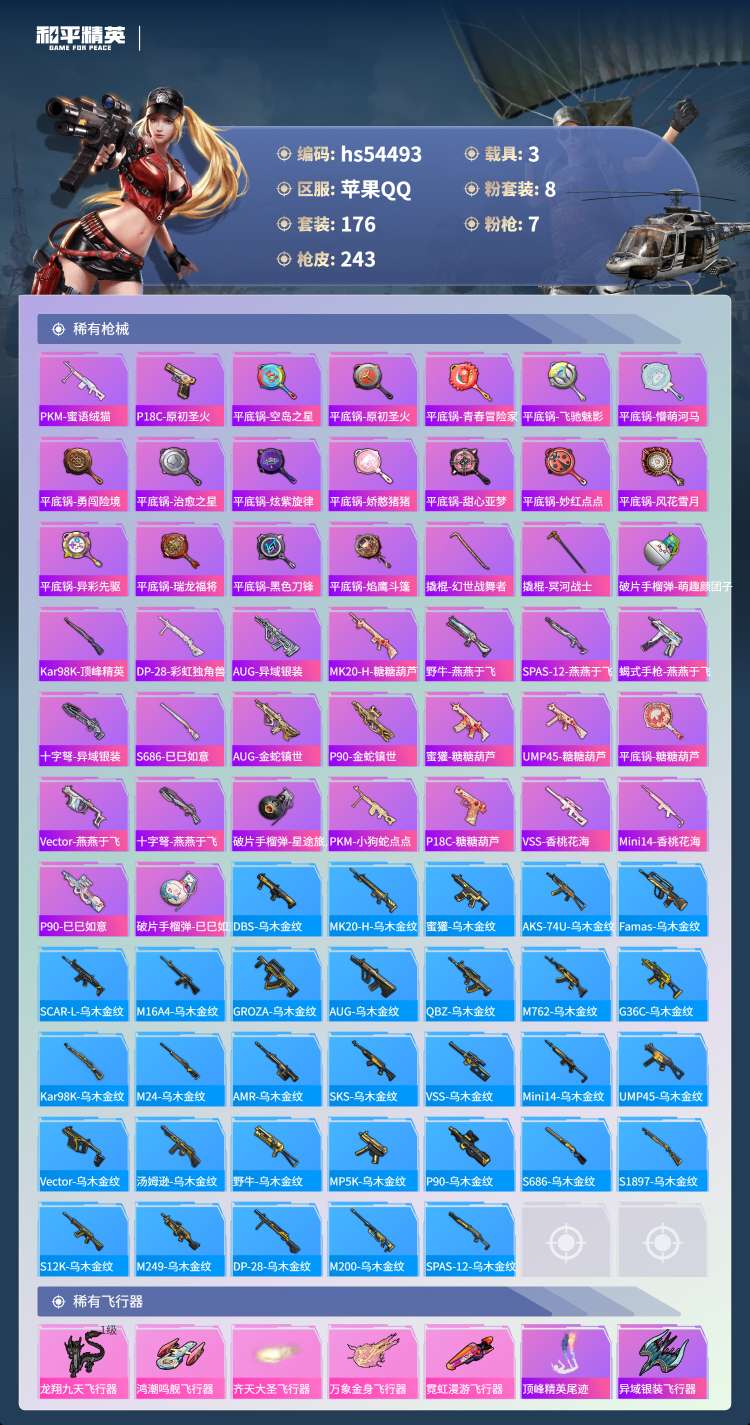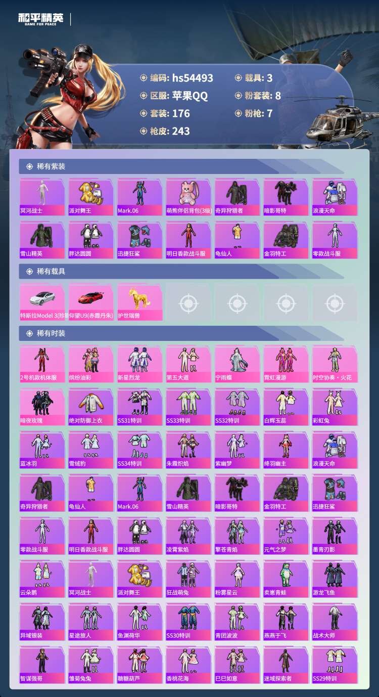 hs54493 苹果手Q-20王牌印记-有战神框-8粉装-7特效枪-3载具-82906热力值-176