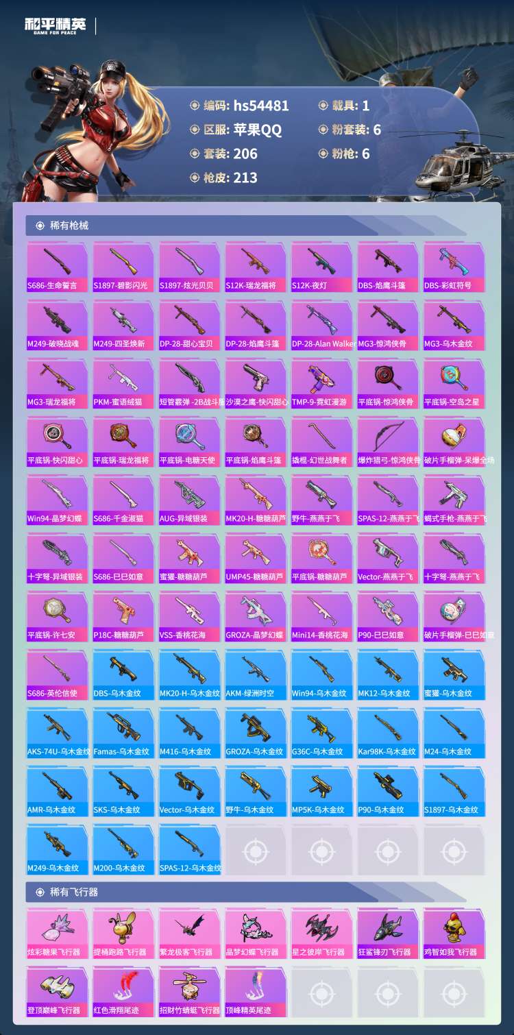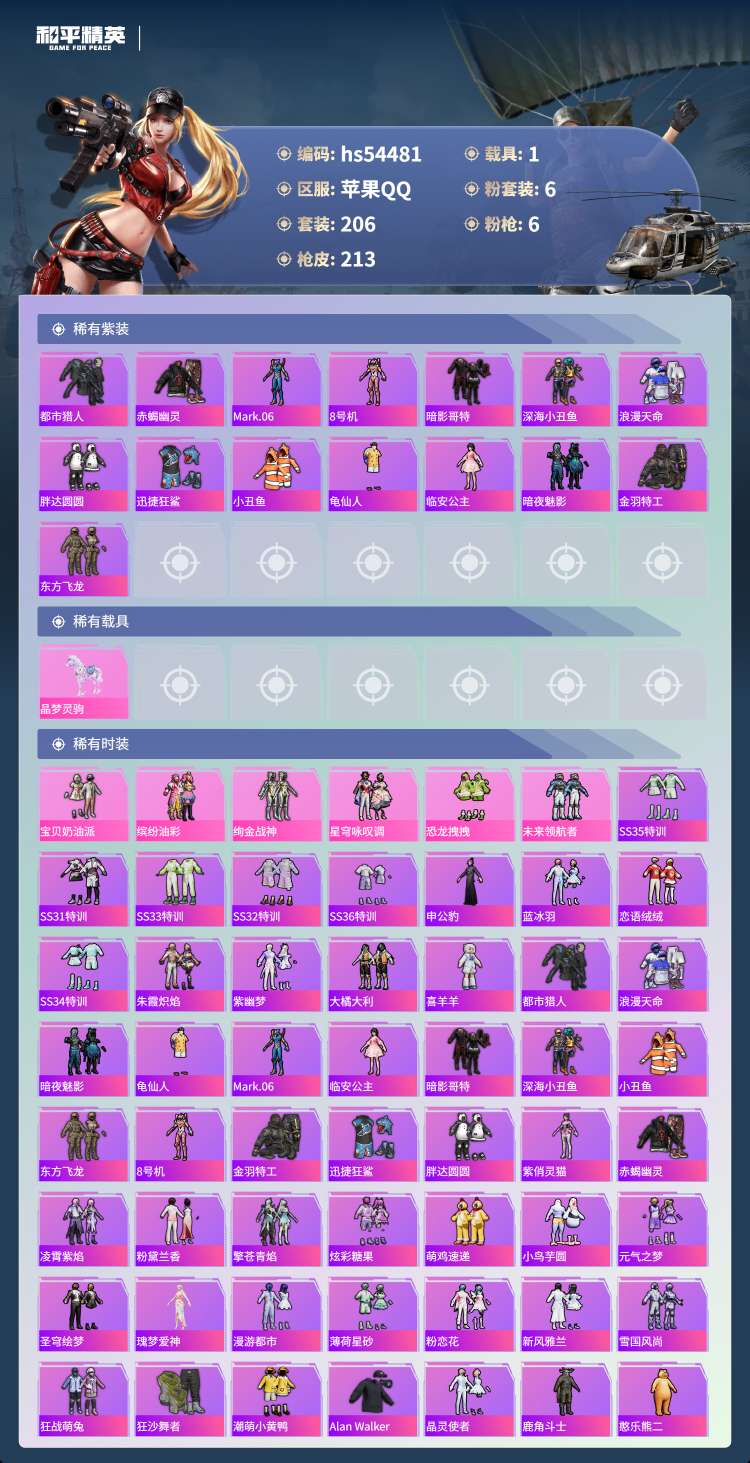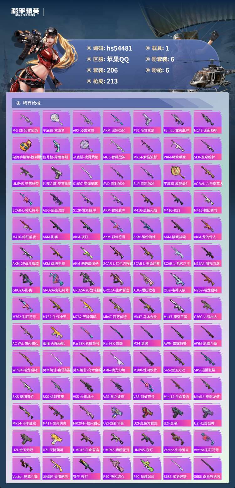 hs54481 苹果手Q-15王牌印记-6粉装-6特效枪-1载具-74728热力值-206套装-21