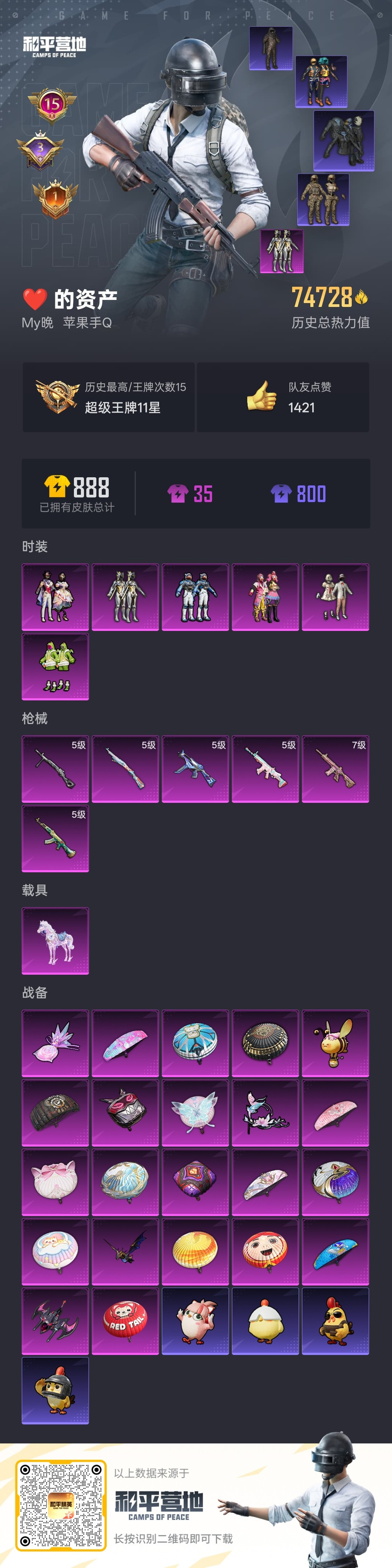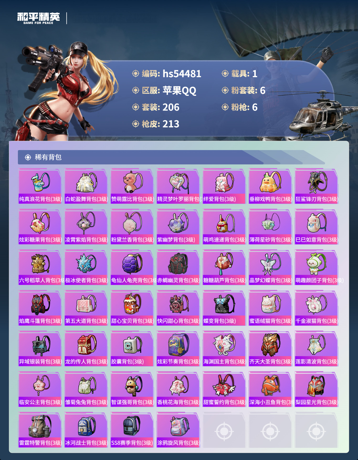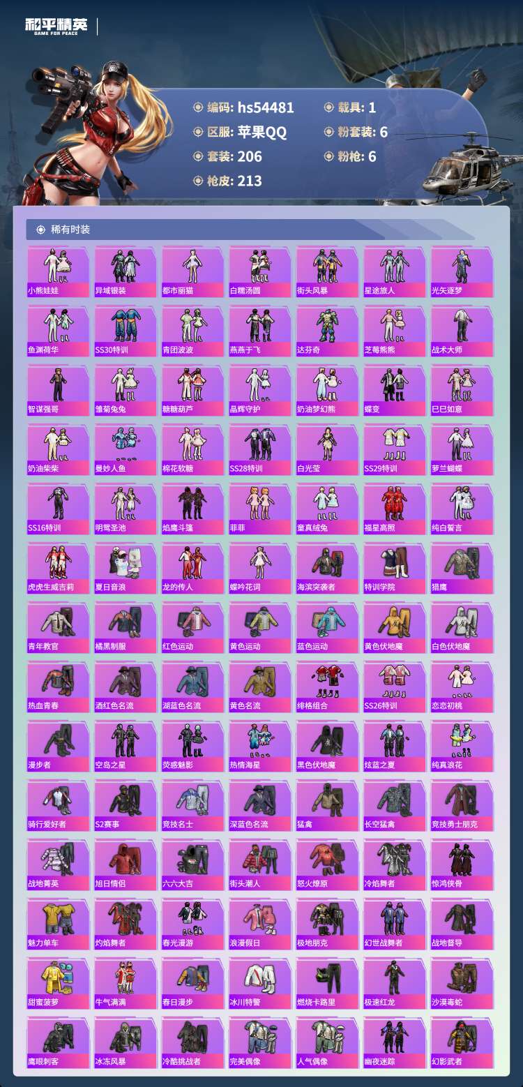 hs54481 苹果手Q-15王牌印记-6粉装-6特效枪-1载具-74728热力值-206套装-21