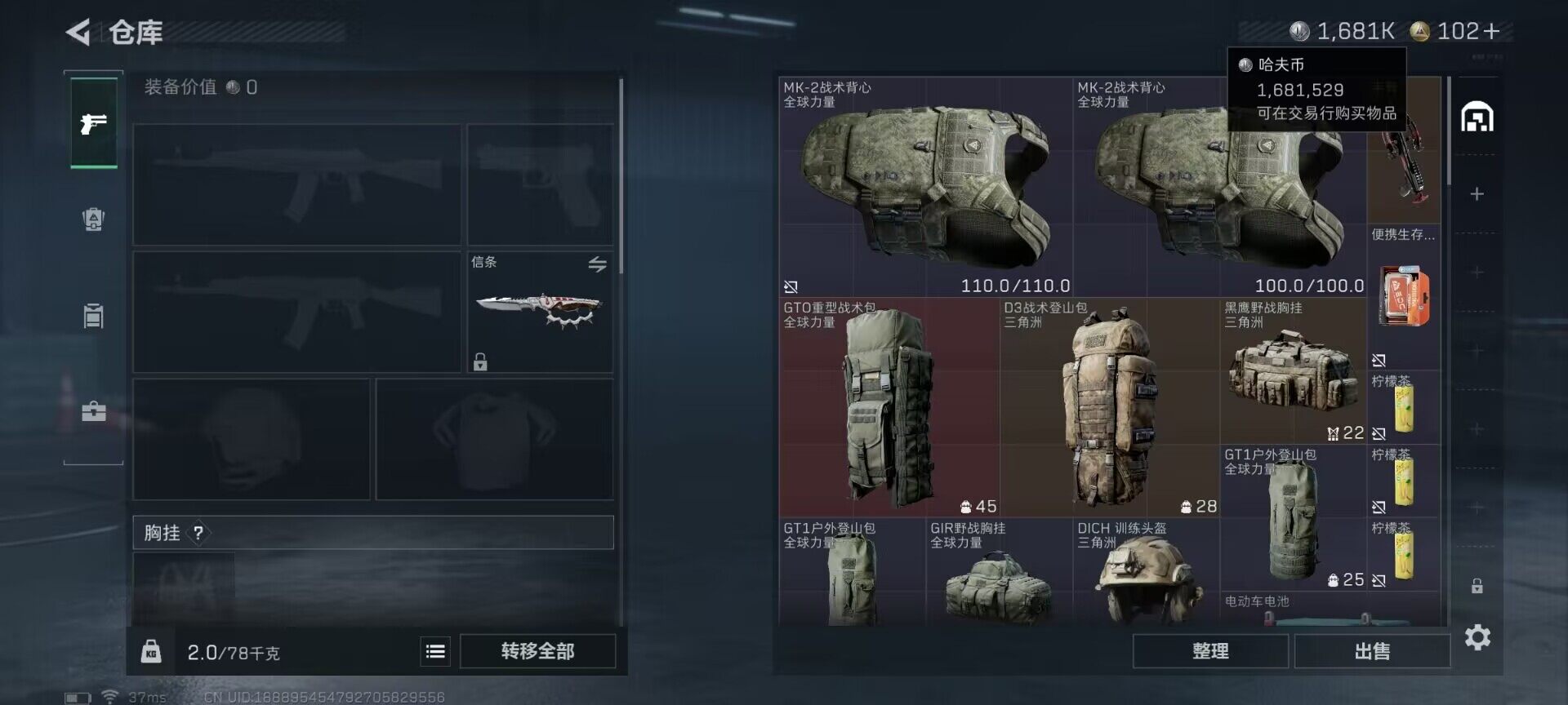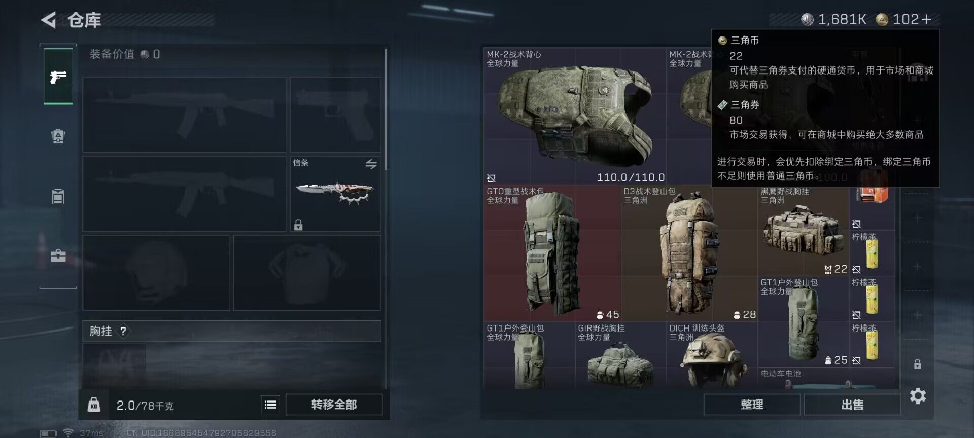总资产(M):18M/哈夫币(K):1681K/全面战场等级:1_段位:无段位/烽火地带等级:60_段位:钻石/