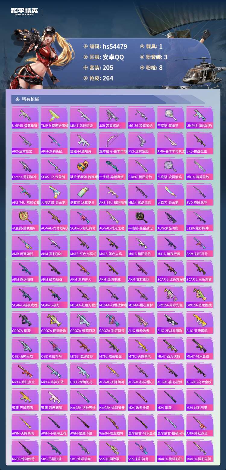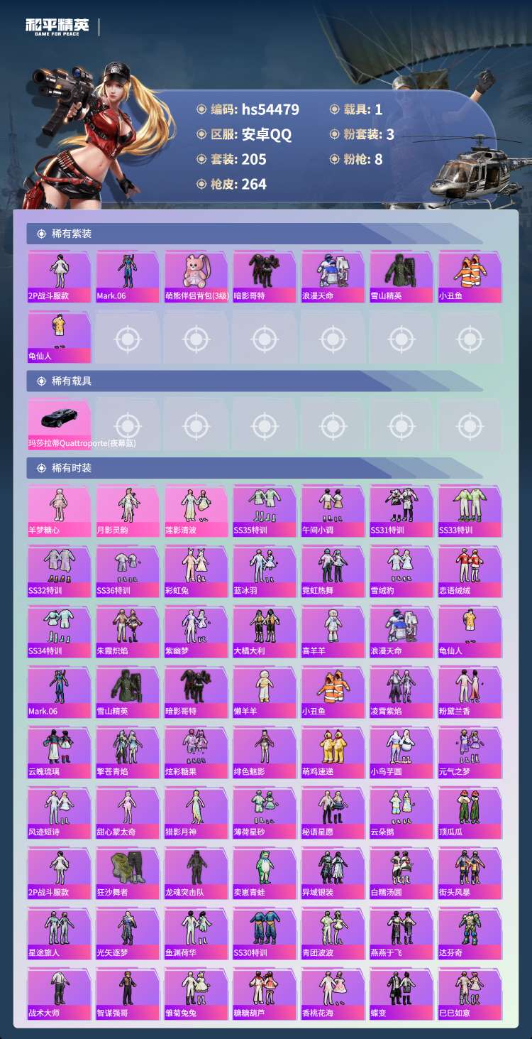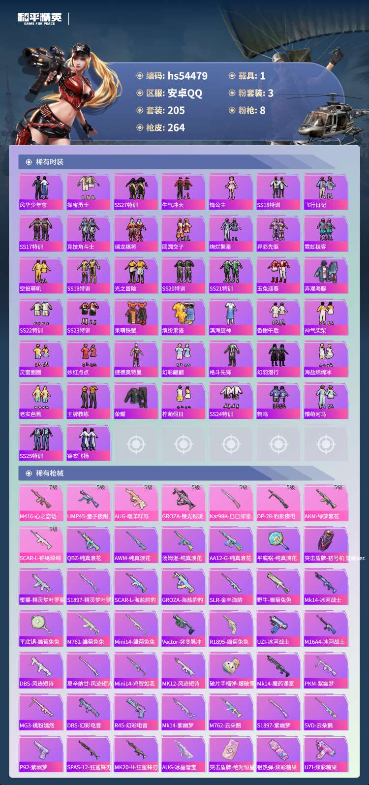 hs54479 安卓手Q-17王牌印记-3粉装-8特效枪-1载具-73645热力值-205套装-26