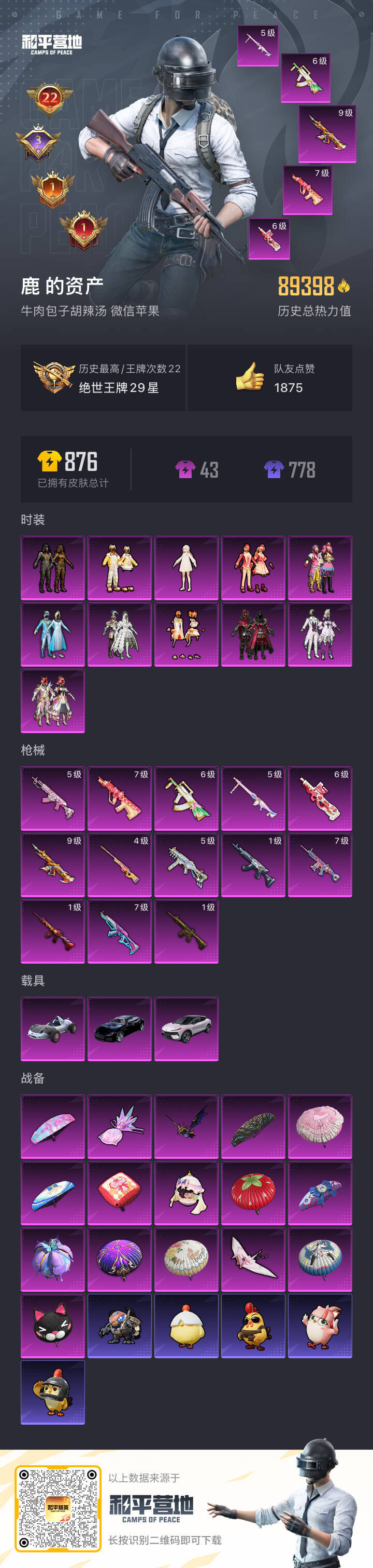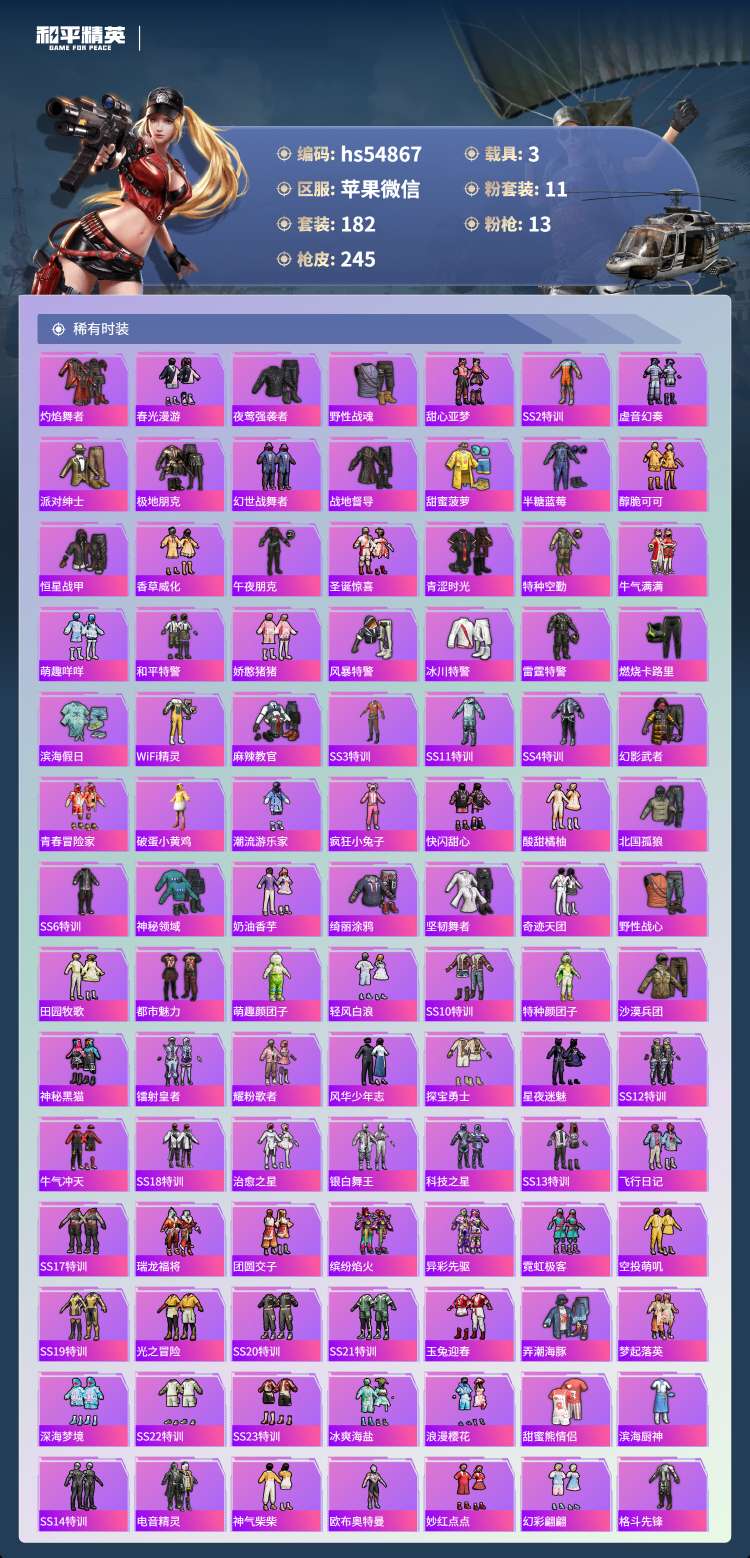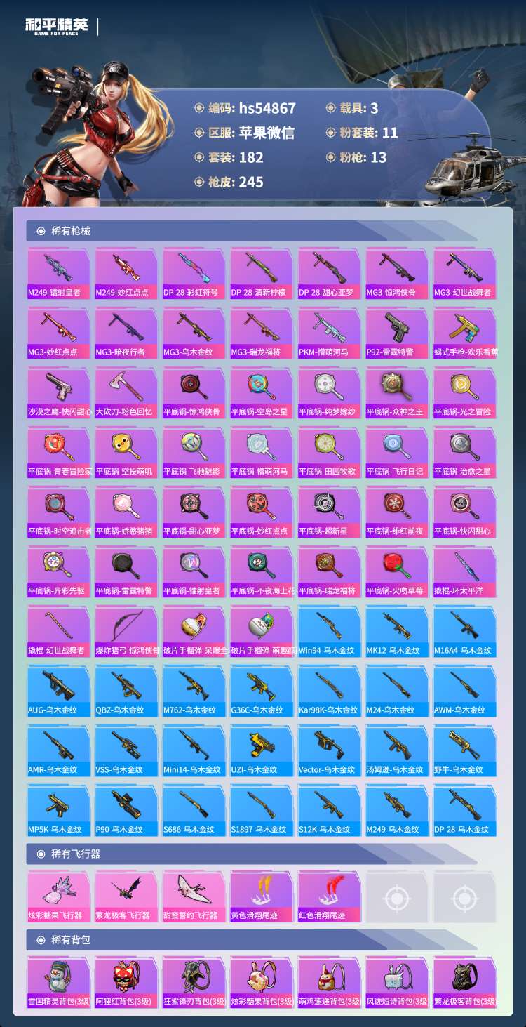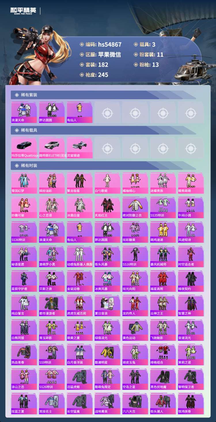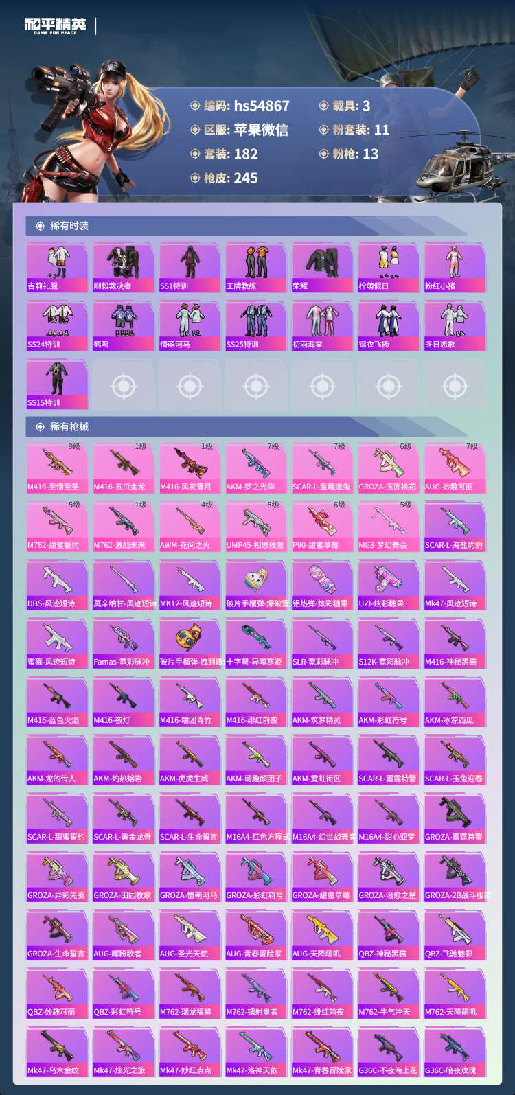 hs54867 苹果微-22王牌印记-11粉装-13特效枪-3载具-89398热力值-182套装-