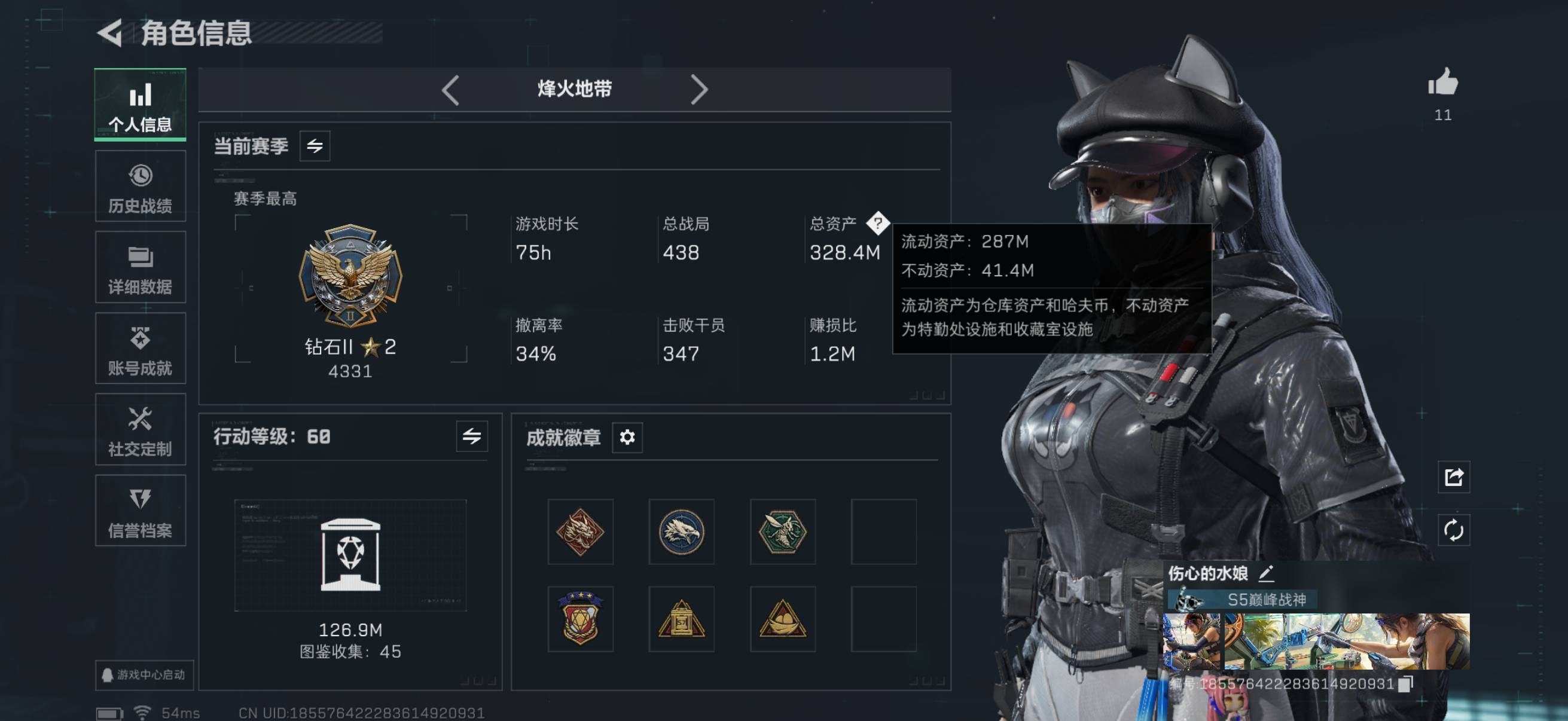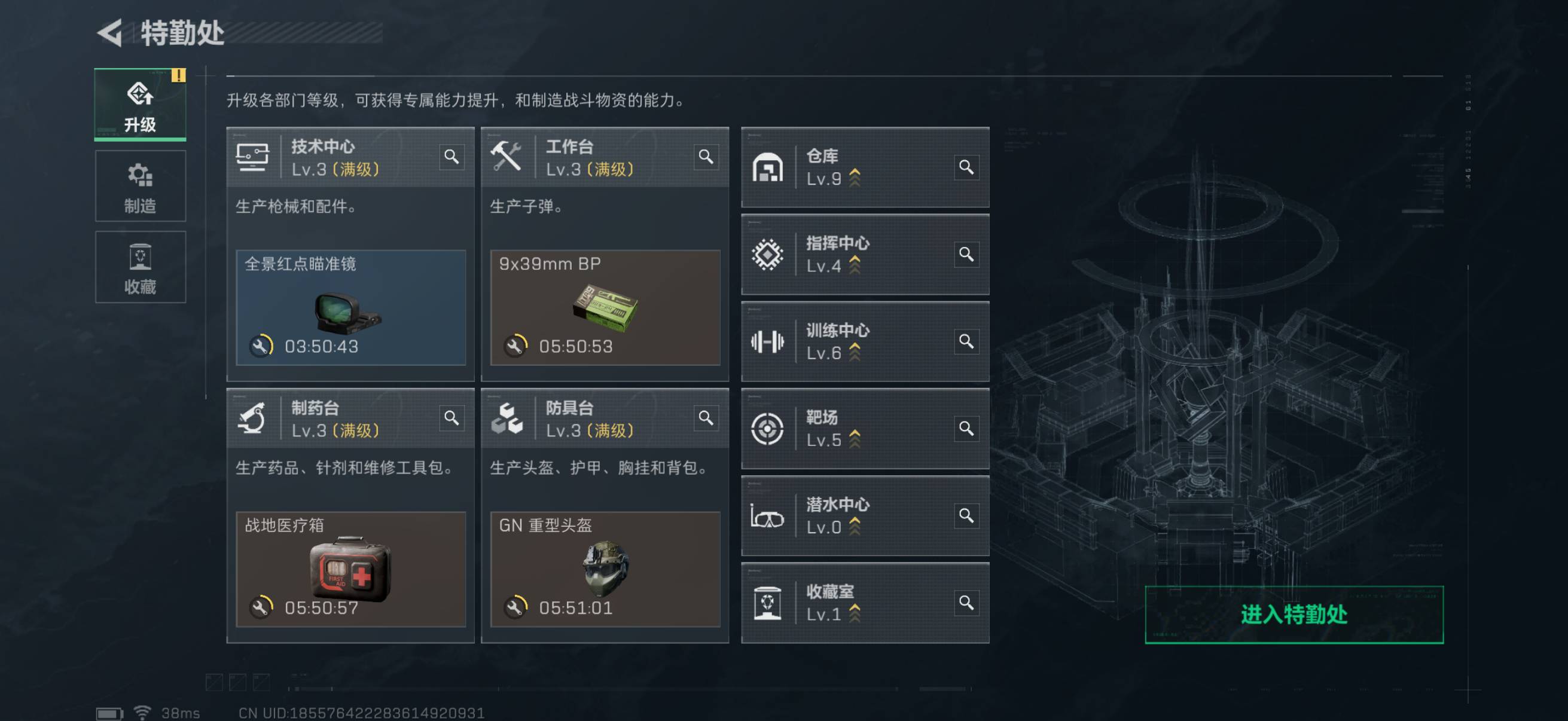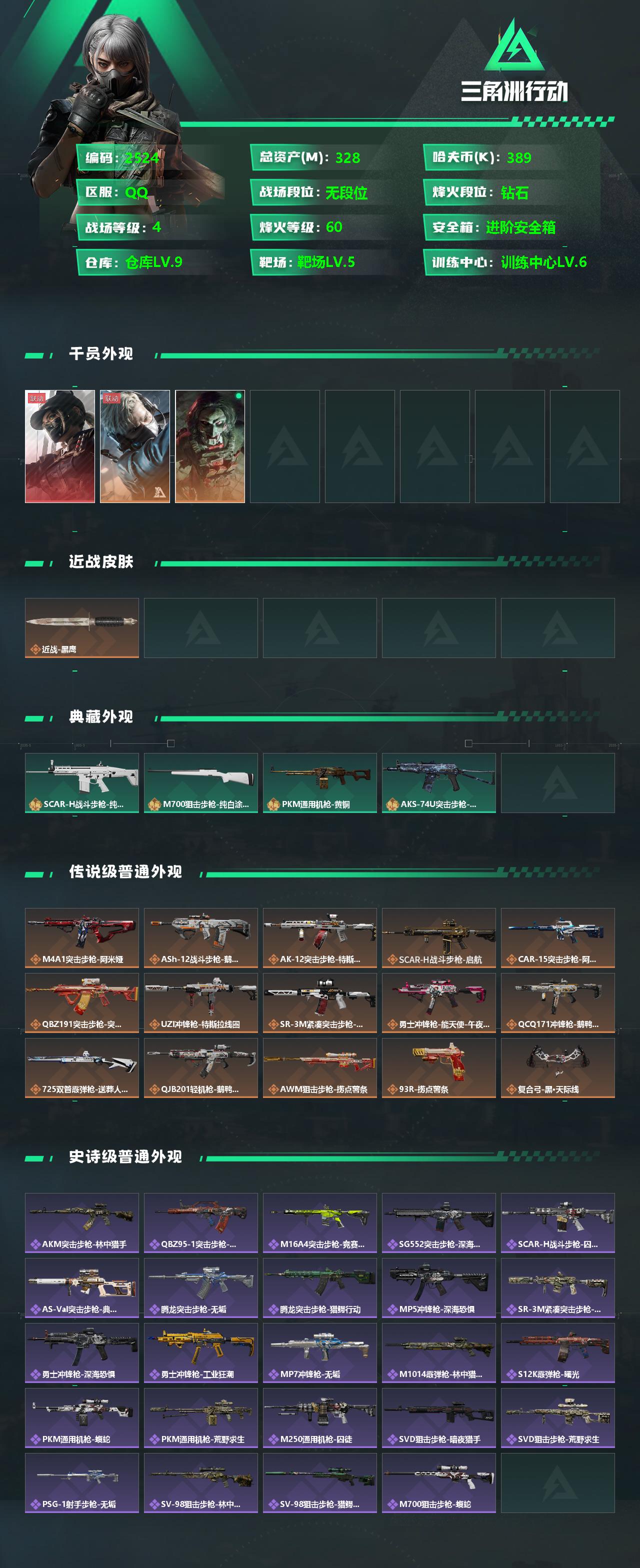 总资产328.4m 哈夫币38k 16枪皮 1红皮 黑天际线 高级安全箱 仓库lv9 训练中心lv6