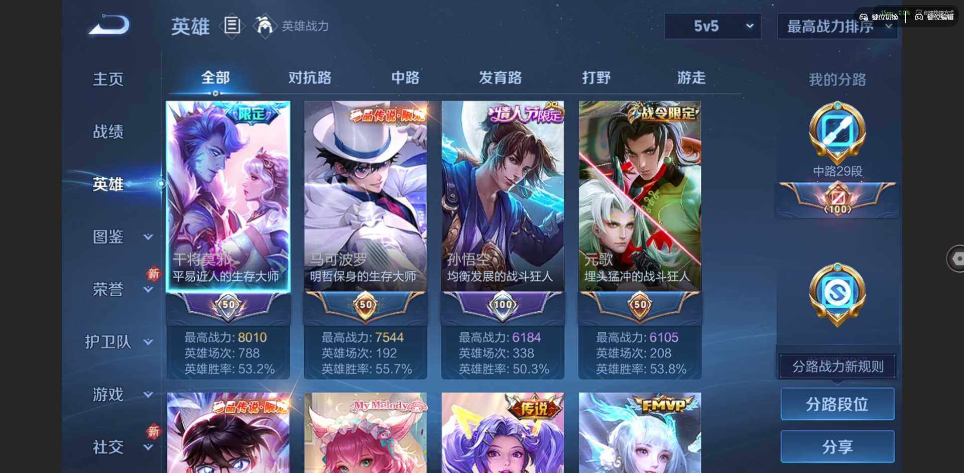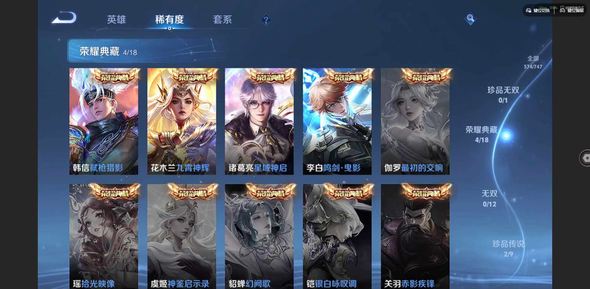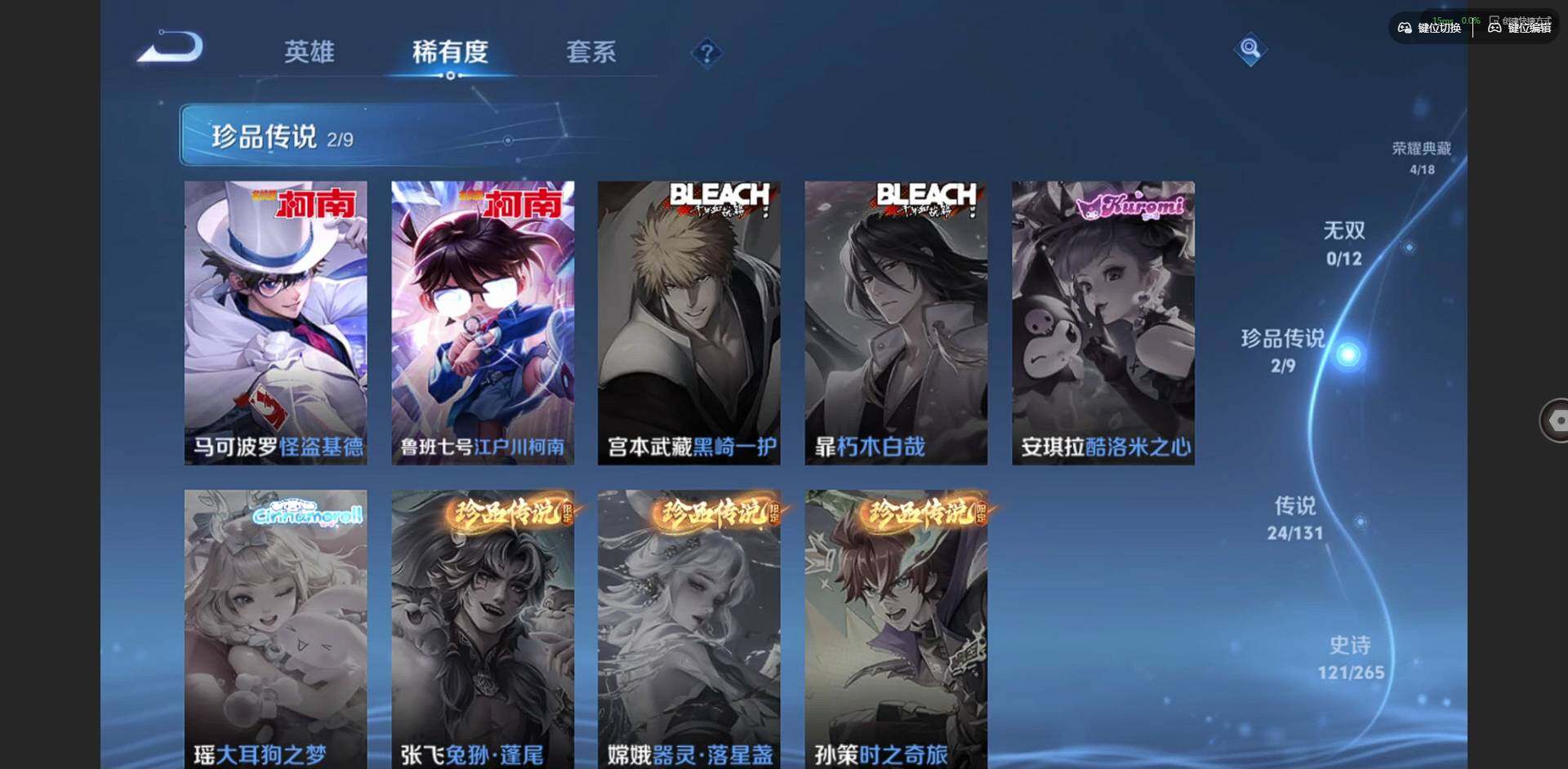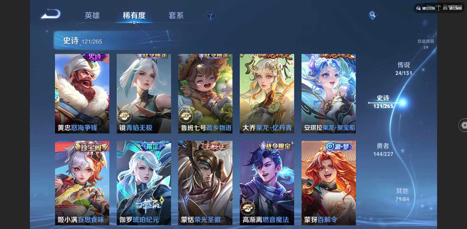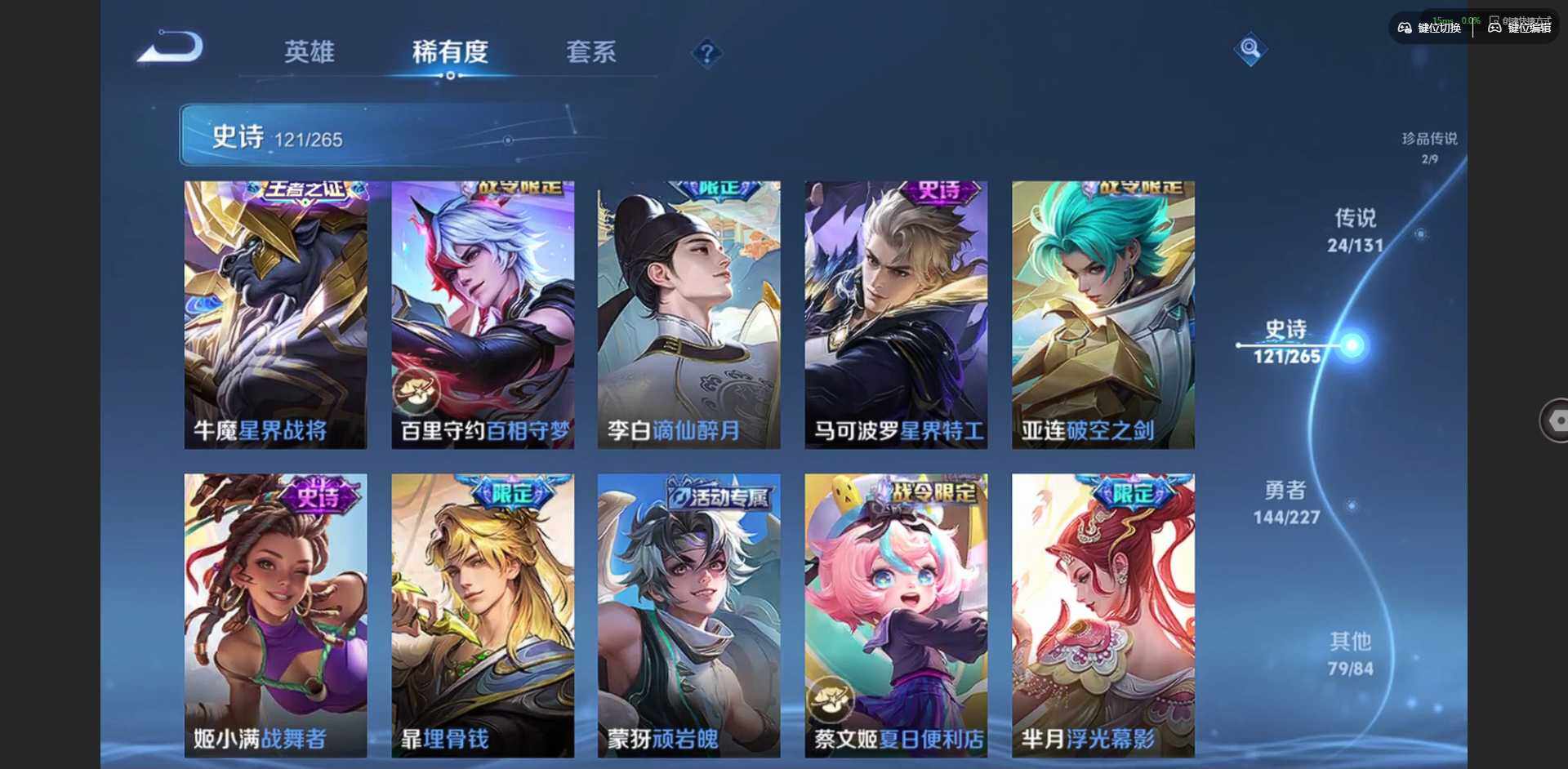 【李信全皮,海月全皮,蒙恬全皮,赵怀真全皮,戈娅全皮,空空儿全皮,影全皮】实名: 可修改 贵族等级: V9 英雄数: 124 皮肤数: 374 荣耀水晶: 鸣剑·曳影,星域神启,九霄神辉,弑枪猎影 珍品传说: 江户川柯南,怪盗基德 传说皮: 黄金射手座,云鹰飞将,黄金白羊座,久胜战神,炽阳神光,一念神魔,音你心动-小乔,胖达荣荣,时之恋人-刘备,游龙清影,淬星耀世