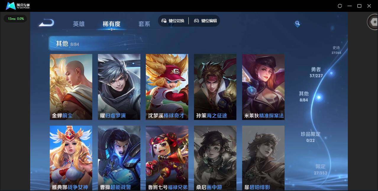 实名: 可修改 贵族等级: V5 英雄数: 99 皮肤数: 75 传说皮: 地