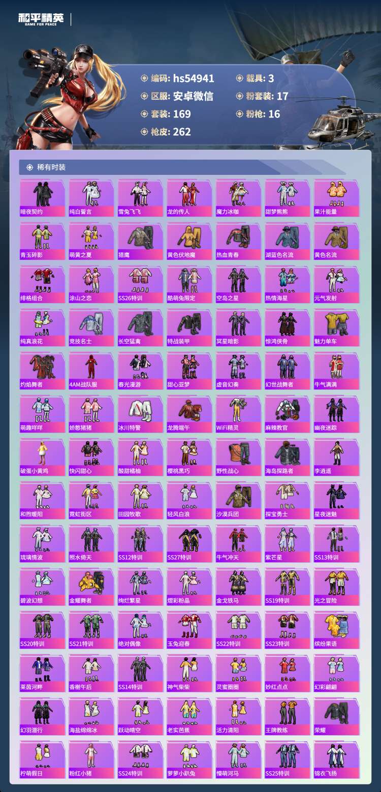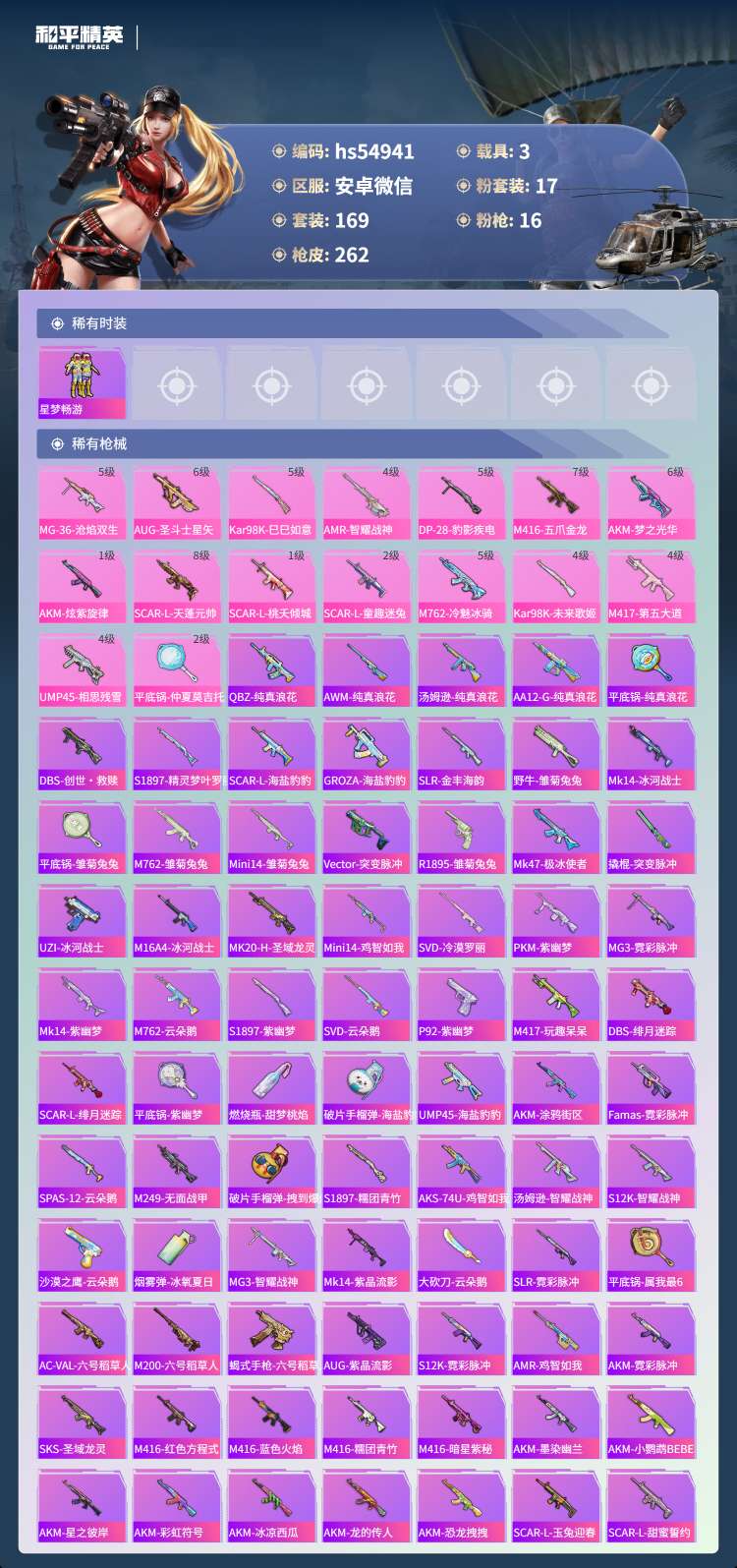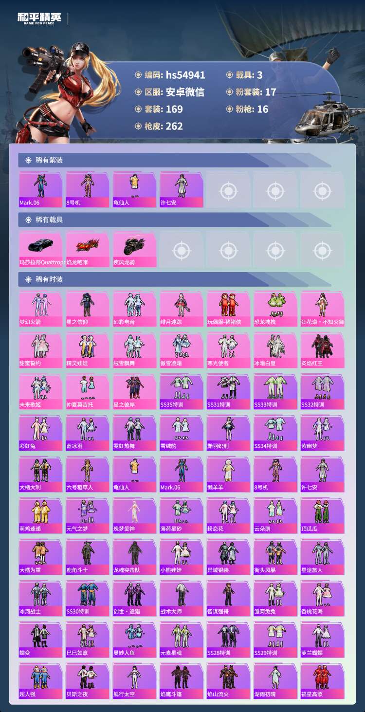 hs54941安卓v-13王牌印记-17粉装-16特效枪-3载具-91530热力值-169套装-2