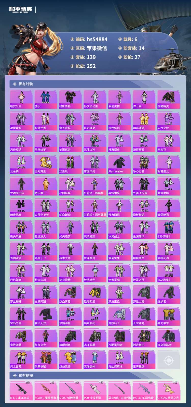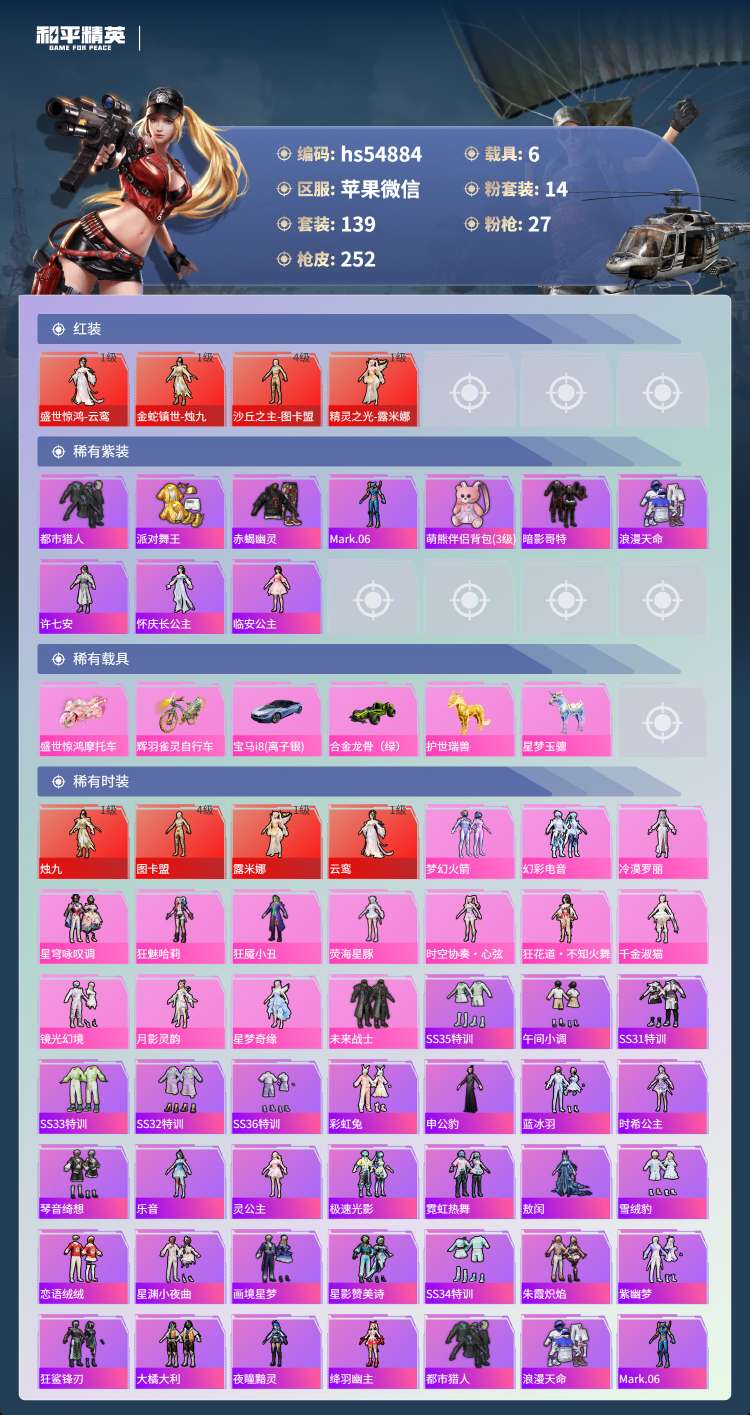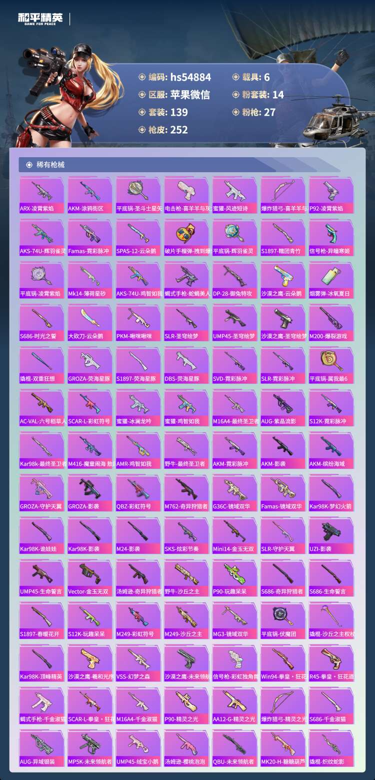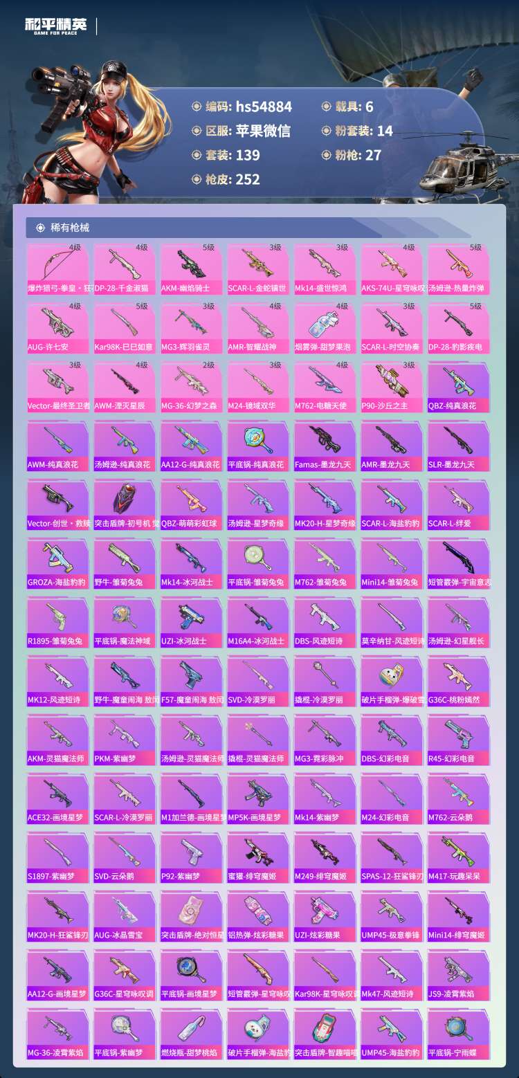hs54884 苹果微-6王牌印记-4红装-14粉装-27特效枪-6载具-100867热力值-13