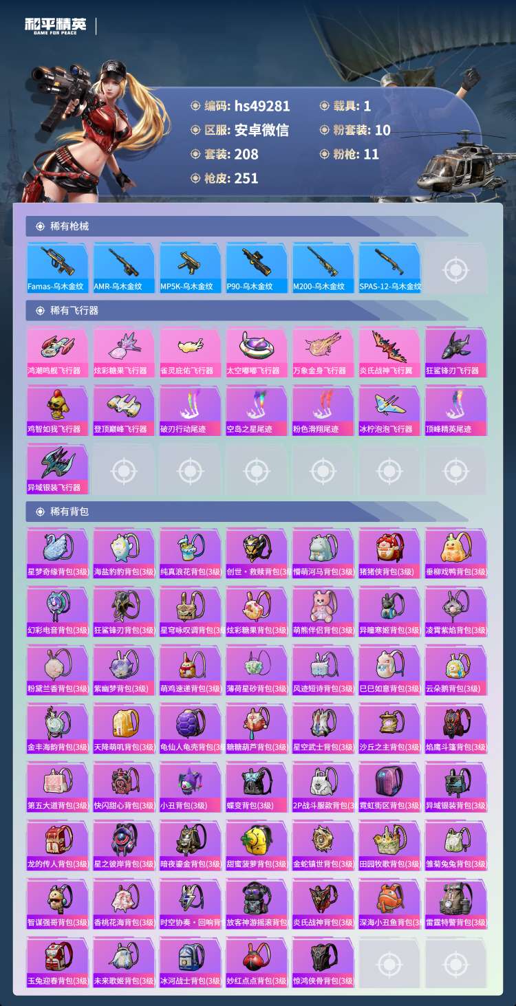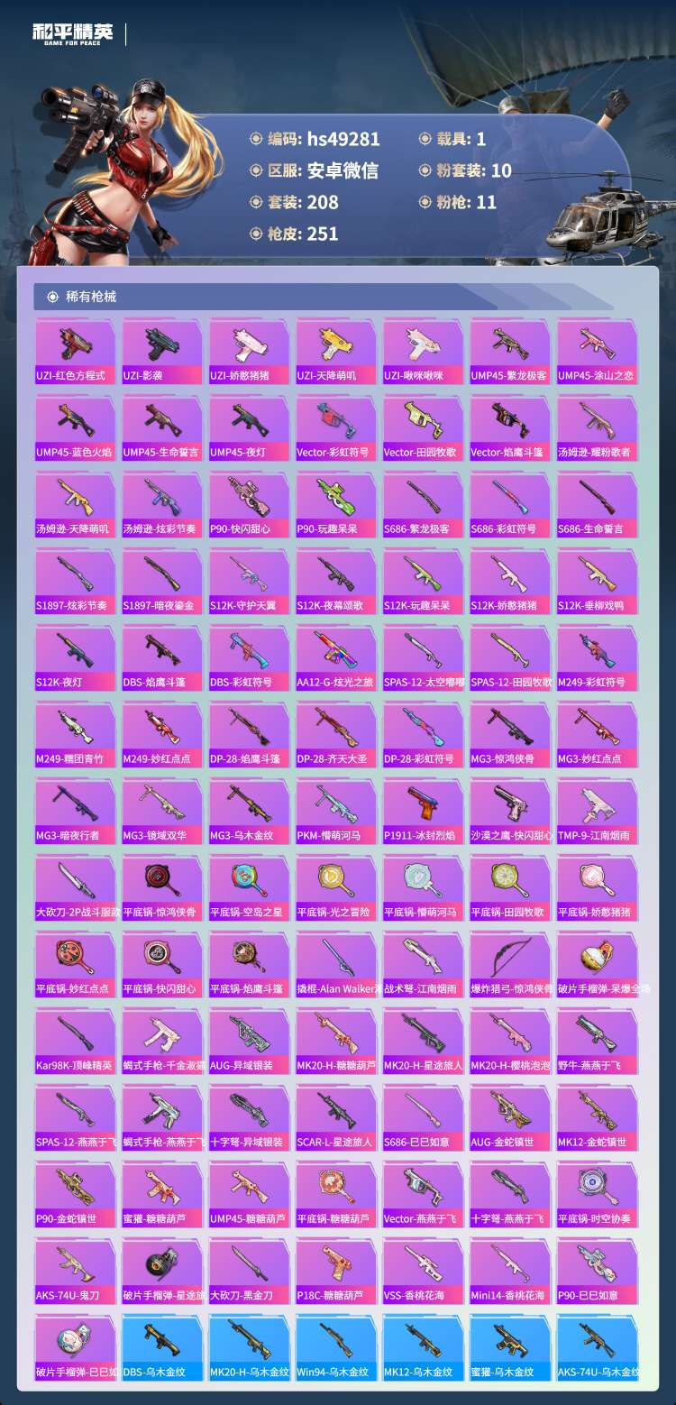 hs49281 安卓微-14王牌印记-10粉装-11特效枪-1载具-87952热力值-208套装-