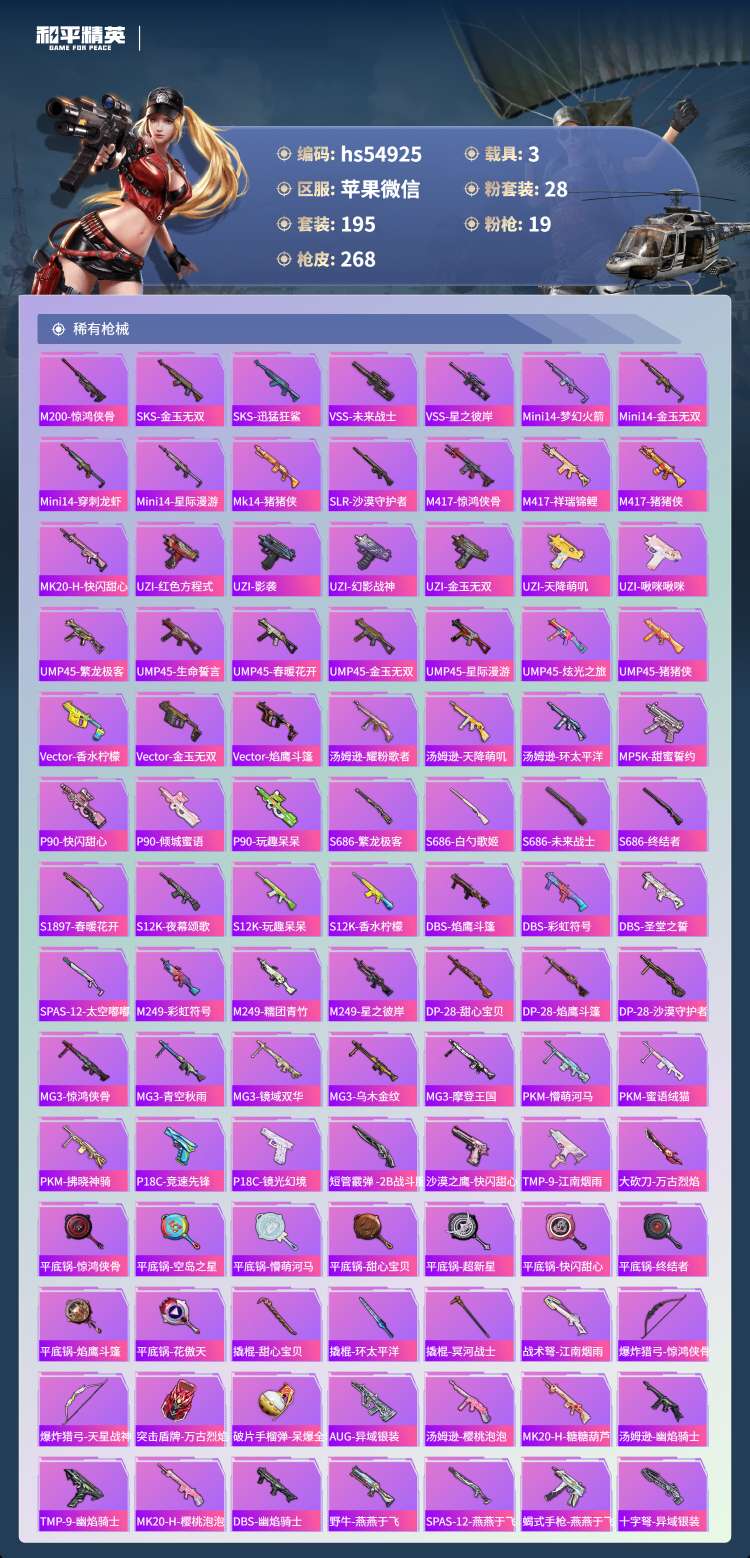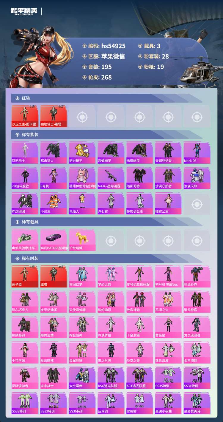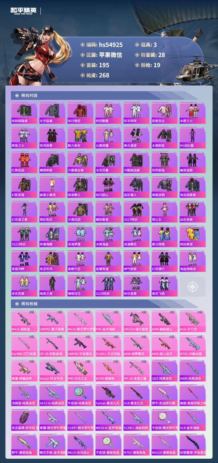 hs54925 苹果v-9王牌印记-有战神框-2红装-28粉装-19特效枪-3载具-108724热
