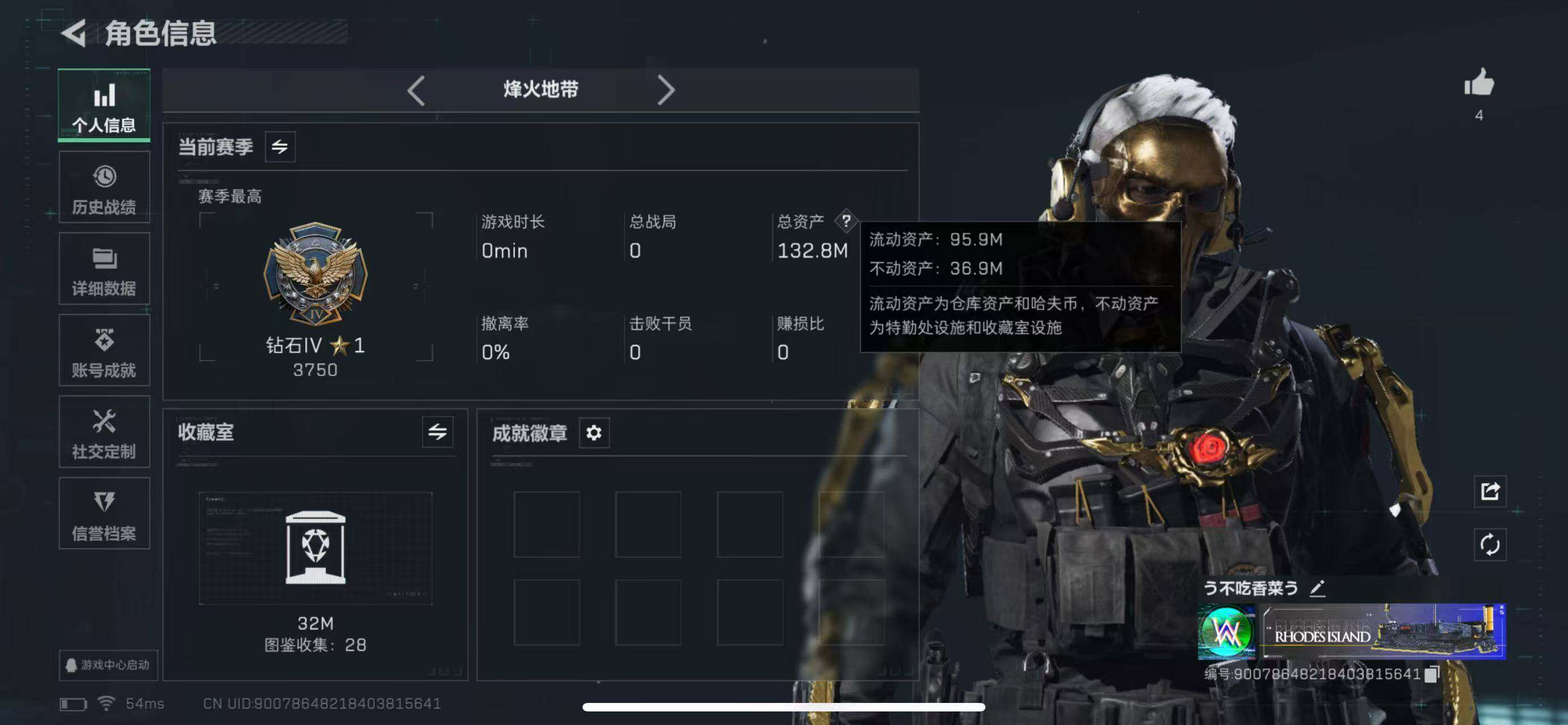 【SJ119】132m总资产-3784k哈伏币-60烽火等级-钻石-9战场等级-列兵