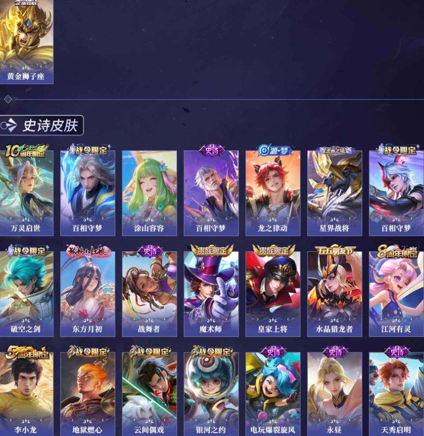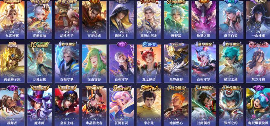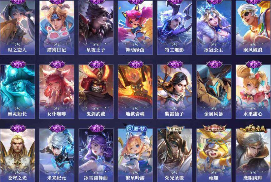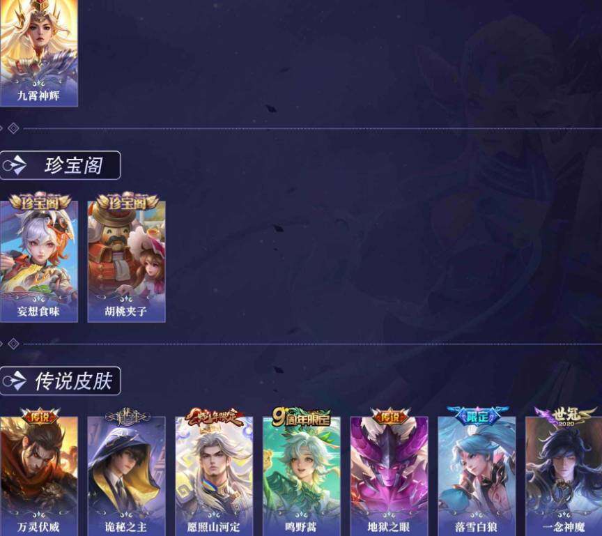 【传说皮肤】:曹操万灵伏威,元歌诡秘之主,司空震愿照山河定,桑启鸣野蒿,亚连落雪白狼,李信一念神魔,达摩黄金狮子座,宫本武藏地狱之眼